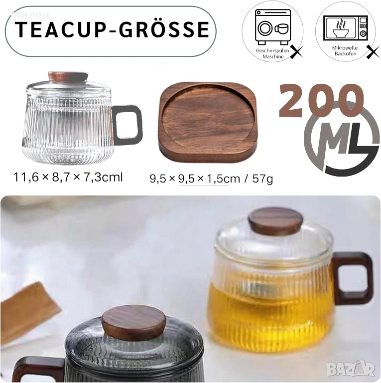 • Високо качество: чашите за чай, цедките за чай и капаците са изработени от висококачествено стъкло, а дървото на капаците и чинийката за чаша е от орех, което демонстрира здрава и издръжлива професионална изработка.