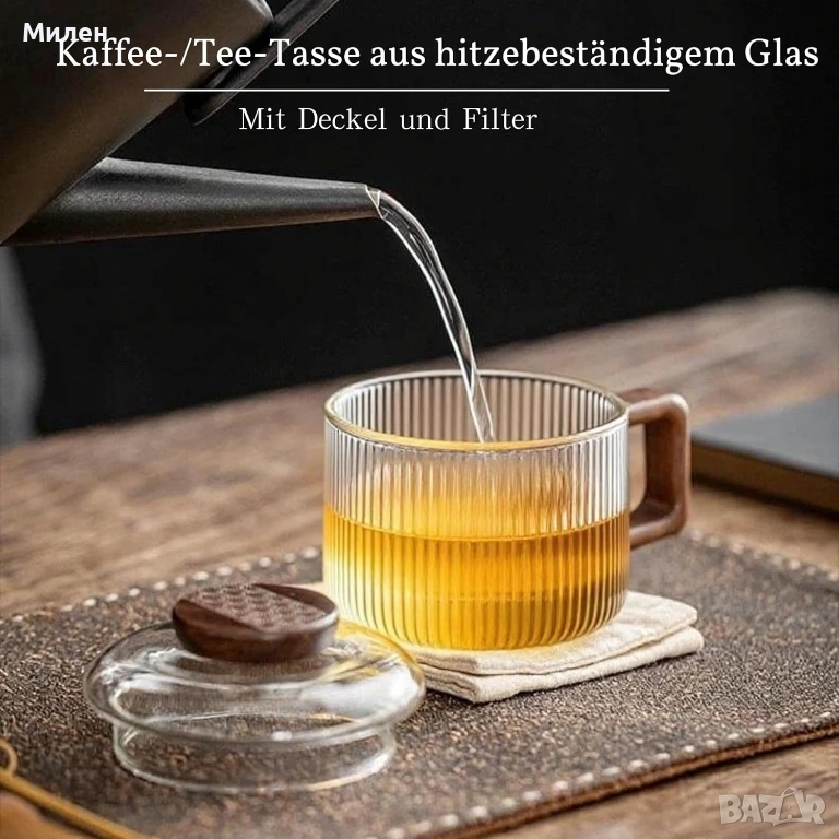 Стъклена чаша за чай JanYoo с капак и цедка 200 мл → Обява 53673510