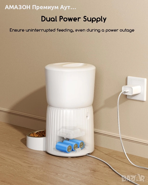 - Двойно захранване: Тази автоматична хранилка за домашни любимци предлага опции за двойно захранване, което позволява захранването ѝ или от DC адаптер, или от 3 алкални D батерии. Това гарантира, че домашните любимци няма да гладуват дори по време на прекъсвания на електрозахранването.