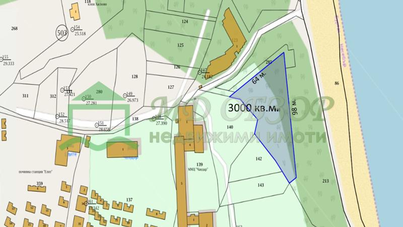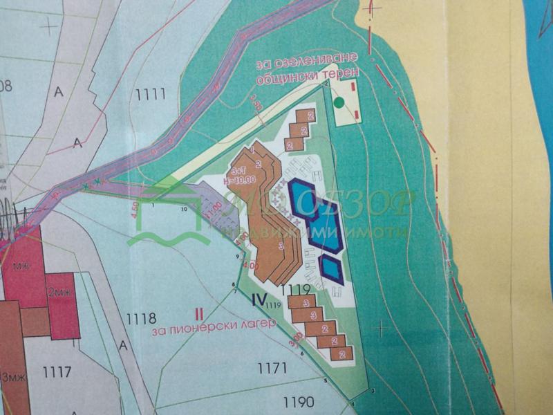 Урегулиран поземлен имот на площ от 3000кв.м., разположен в южната курортна зона на гр. Обзор. Има одобрен подробен устройствен план план за регулация и застрояване от 2008г. с установени градоустройствени показатели: Пл.=30%; Кинт. = 1.49; максимална височина Н=10.00м. и минимално озеленена площ 45%, с отреждане за 'Курортно строителство'. Естествената денивелация на имота и близостта до плажа гарантират морската панорама.