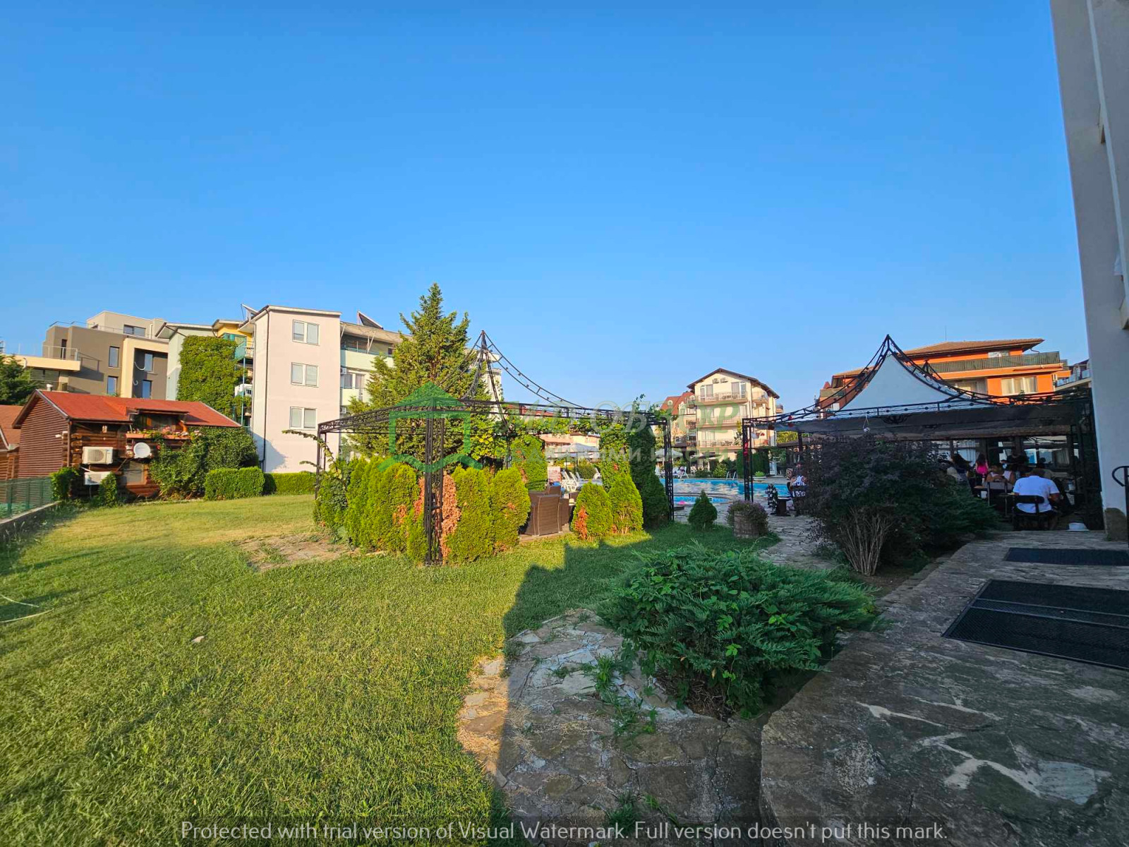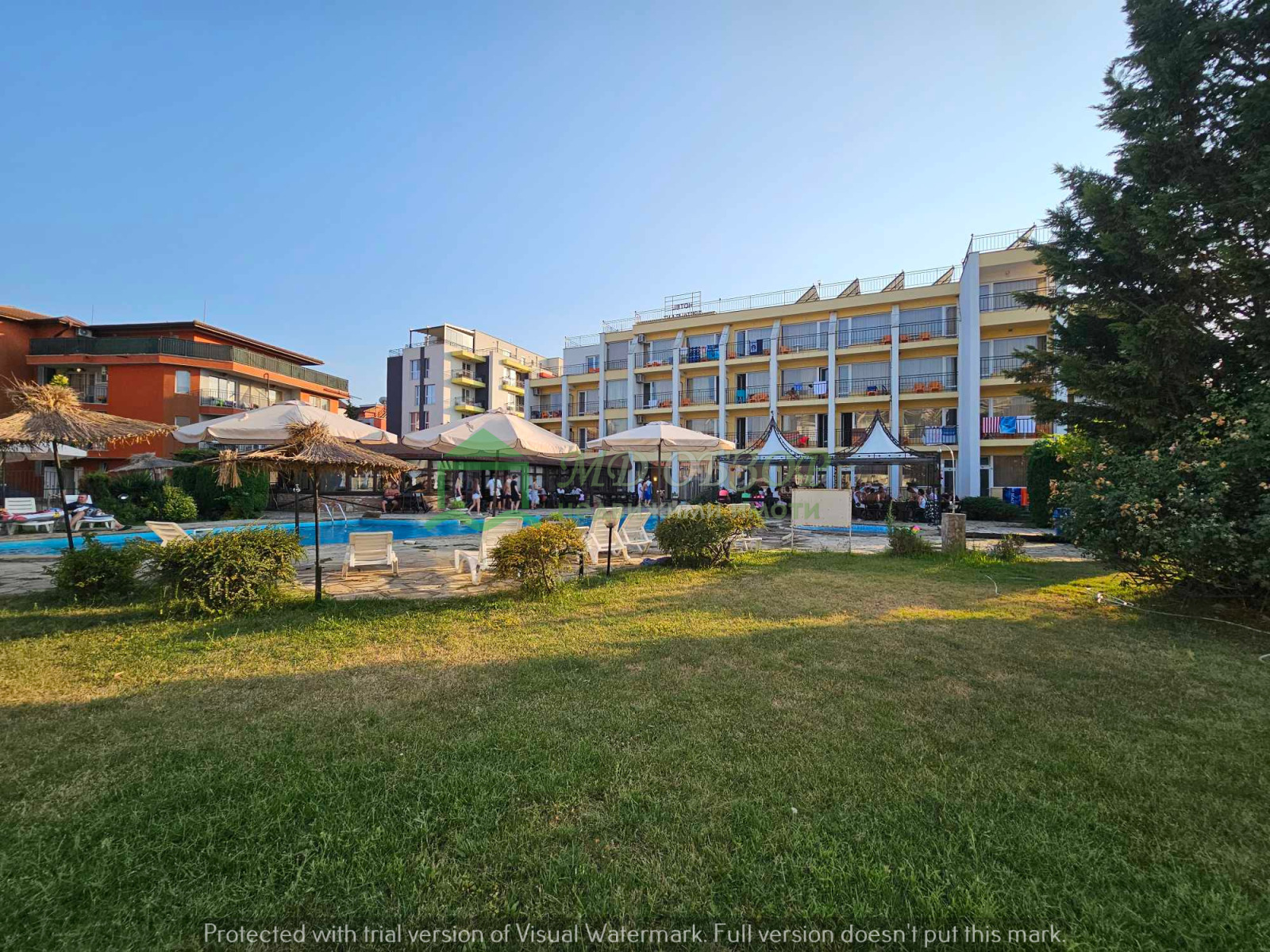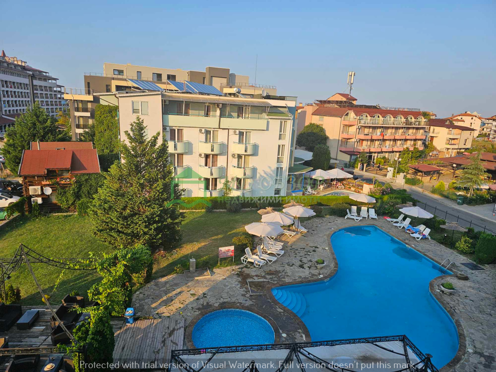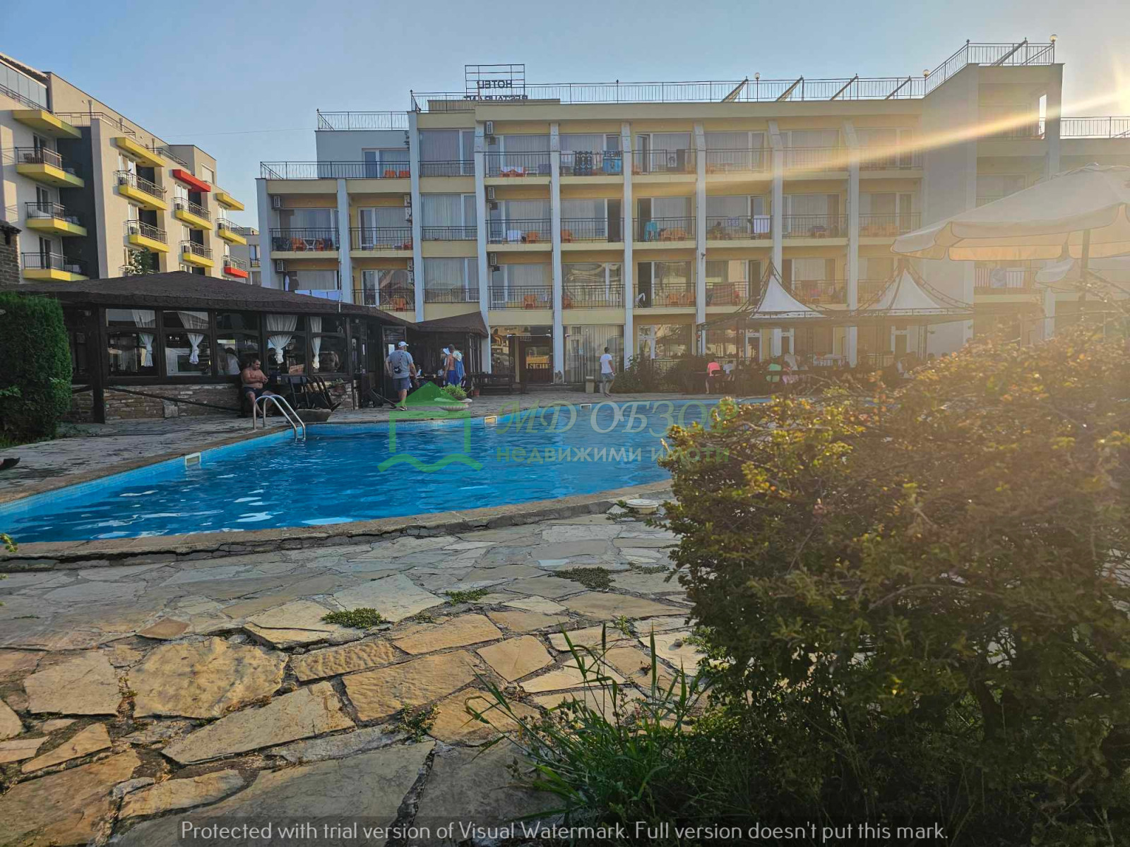 Предлагаме ви за продажба функциониращ хотелски комплекс на 200м. от морето и на 300м. от центъра в град Обзор. Разположен е в бързоразвиващ се квартал с новоизградени жилищни сгради и хотели. Построен и въведен в експлоатация през 2007г., хотелът разполага с голям и детски басейн /210куб.м./, паркинг, модерна рецепция и фоае, офис, магазин с лице към главна улица, ресторант със закрита и открита лятна част /за 150 гости/. Легловата база е 30 стаи за 2+1 гости и 7 фамилни стаи за четири човека /общо 118 гости/. Разгъната застроена площ на сградата е 1535кв.м., площ на парцела 2043кв.м. Етажи 4 плюс един подземен. Има одобрен подробен устройствен план за построяване на още една сграда в парцела с РЗП 1223кв.м. Има възможност за закупуване на хотела заедно с регистрираната фирма, занимаваща се с туристическа дейност с перфектна банкова история. Хотелът е добре познат на туристическия пазар. При проявен интерес може да Ви изпратим допълнително чертежи, снимки и още информация! Без комисионна от купувача!