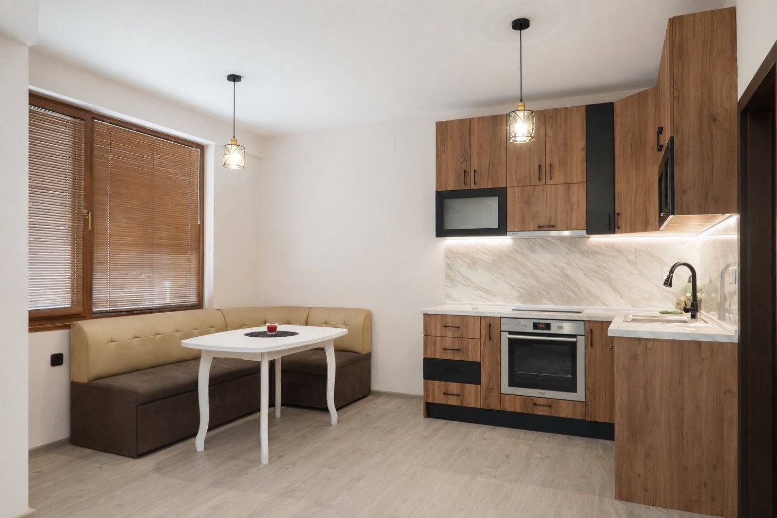 Апартаментът е завършен с висок клас материали.