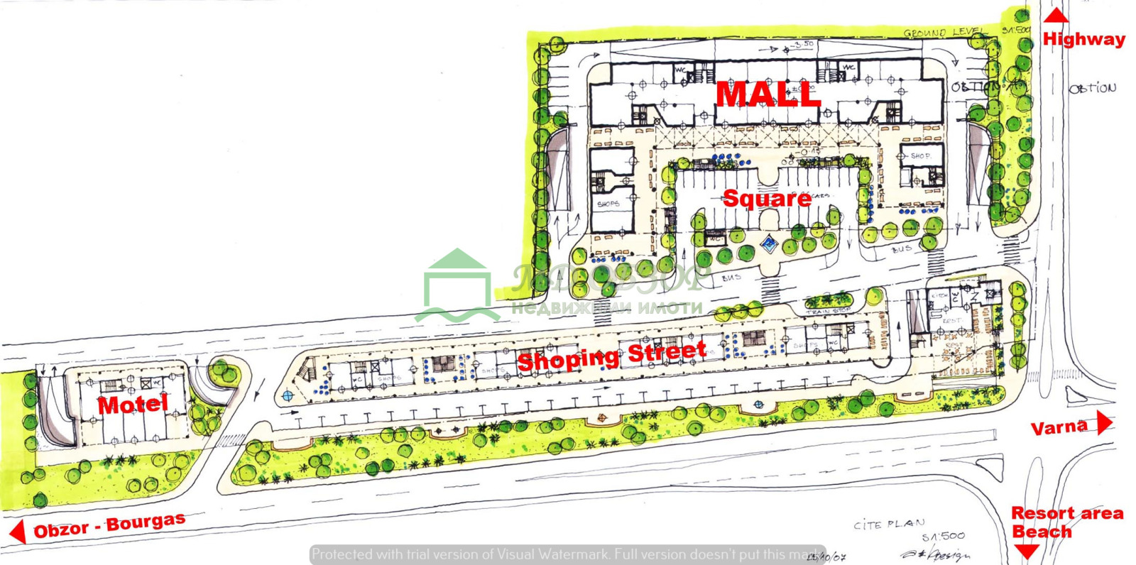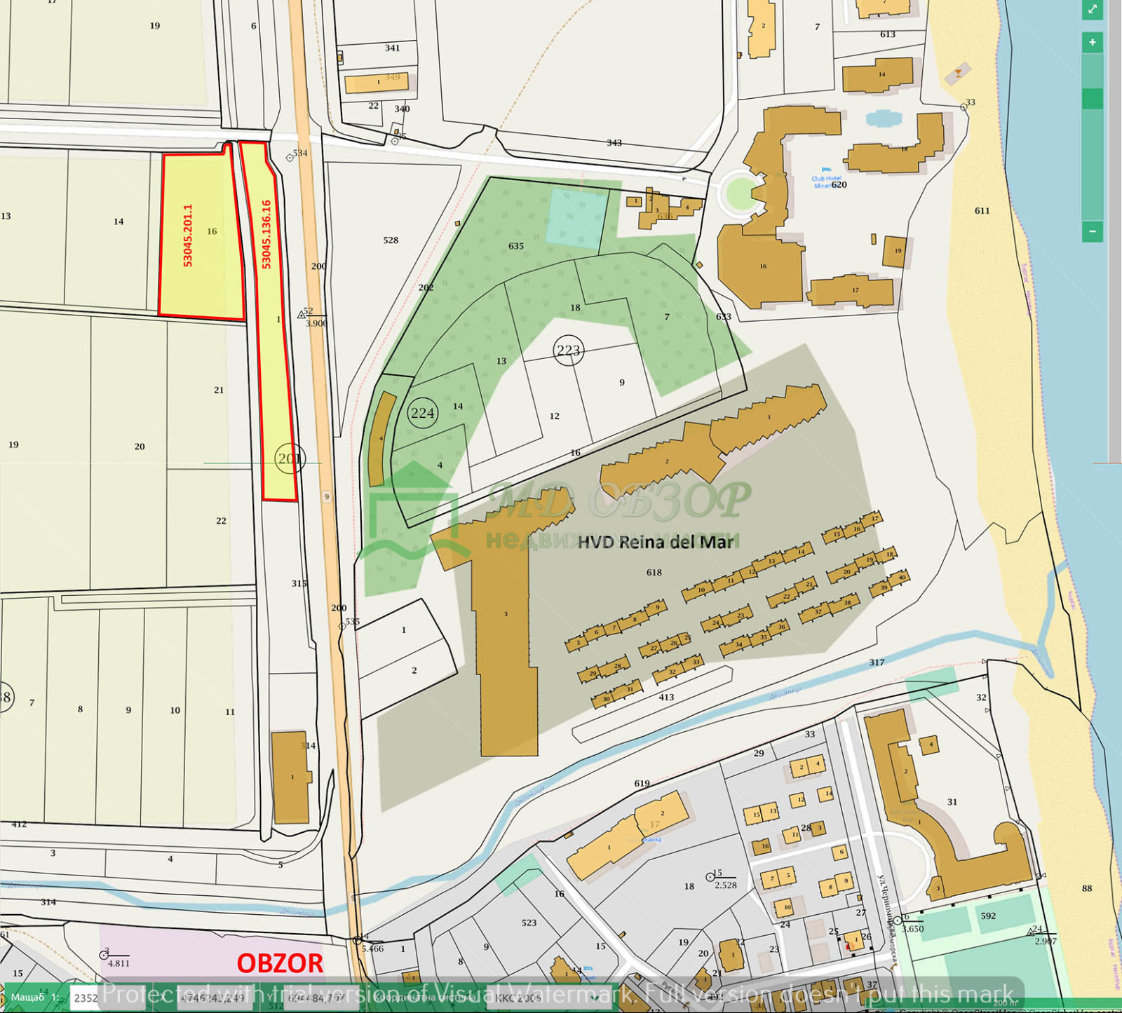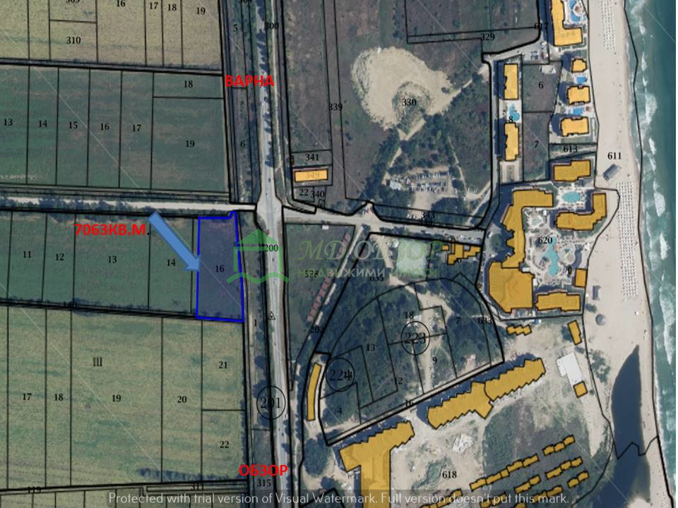 ТОП ЛОКАЦИЯ ЗА КРАЙПЪТЕН ТЪРГОВСКИ КОМПЛЕКС!!!Имотът е ъглов, разположен на главен път Бургас - Варна /лице 260м./ на кръстовището за Дюленския проход /лице 26м./ и на 200м. от градската част на град Обзор. С виза за проектиране при градоустройствени показатели: Пл=39.10%; Кинт.=1.19 и Нкорниз=10.00м.Вид територия урбанизирана; начин на трайно ползване: за търговски обект комплекс. Подходящ е за изграждане както на търговски обекти, хипермаркет, къмпинг, градински център и др. Канализация и водопровод на 200м; в имота има електропровод 20кV, за който е осигурен необходимия сервитут. Срещу имота са изградени нови хотелски комплекси. За подновяване на визата за проектиране е необходимо актуализация на Решението за смяна на предназначението. Допълнителна информация може да предоставим при проявен интерес и осъществен оглед!Предмет на продажба е и граничещ на него имот на площ от 7062кв.м. на цена от 170 000 евро /без ДДС/ с отреждане: за жилищен и хотелски комплекс, който може да бъде приобщен към него. При интерес за закупуване и на двата имота цената може да се договори допълнително!Възможно е и придобиването на дружеството, собственик и на двата имота! Без комисионна от купувача!