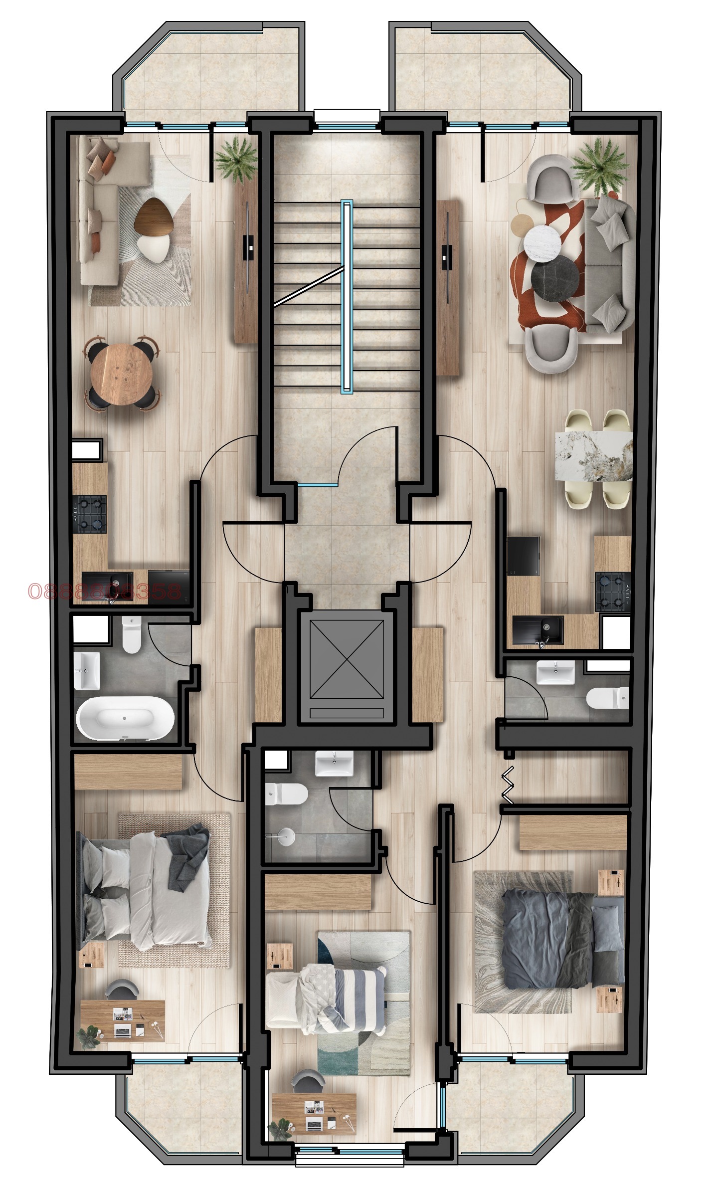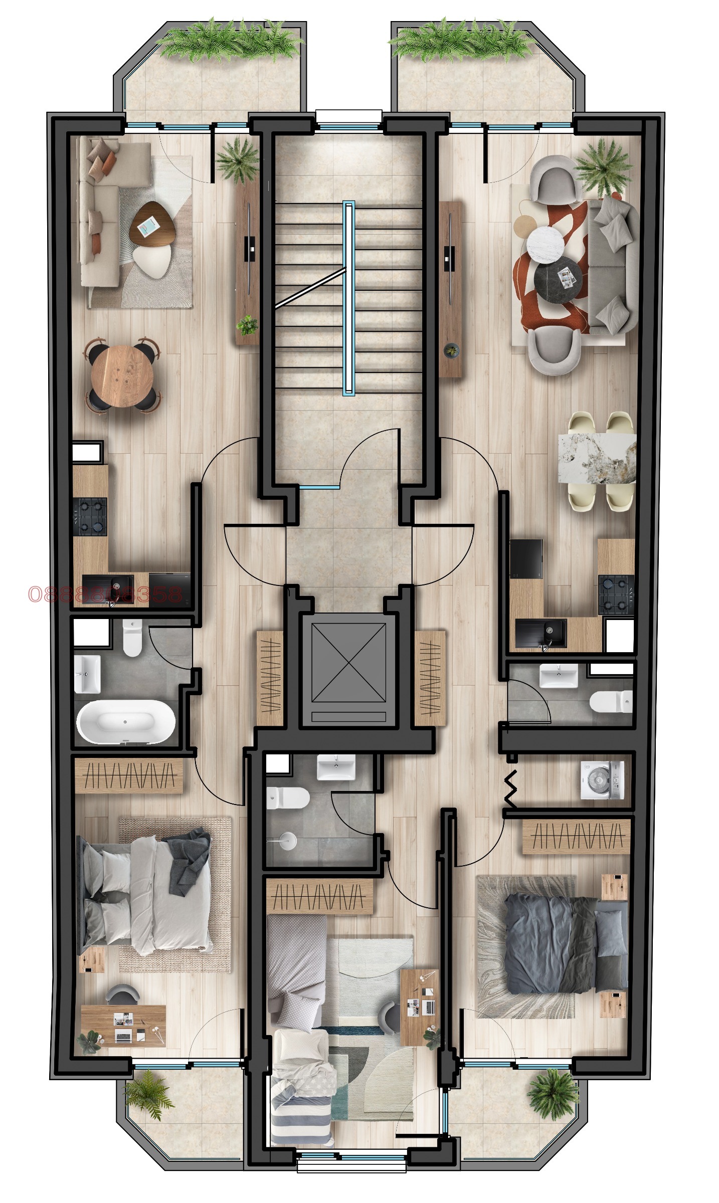 Предлагаме в малка бутикова сграда от 11 апартамента, просторни, слънчеви двустаен и тристайни апартаменти, намиращи се от втория до шестия етаж.Двустайния апартамент е със самостоятелен склад - застроена площ 66,79м2; общи части 25,74м2 или обща площ=92,53м2. Тристайните апартаменти- застроена част 87,49м2; общи части 33,72м2или обща площ 121,21м2. Въвеждане в експлоатация на срадата се планира към лятото на 2026г. Изложението е югозапад -североизток, а големите прозорци допринасят за добрата осветеност на помещенията. Дограмата е висок клас, с троен стъклопакет и прекъснат термомост -отопление на ТЕЦ.