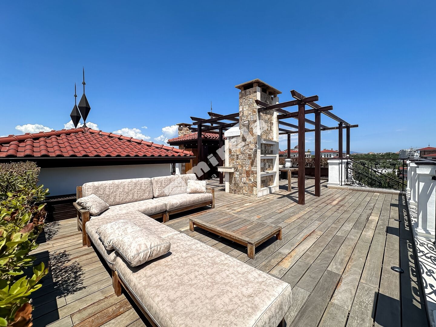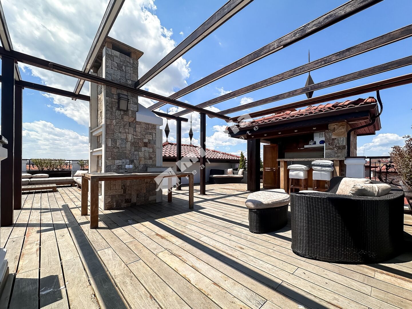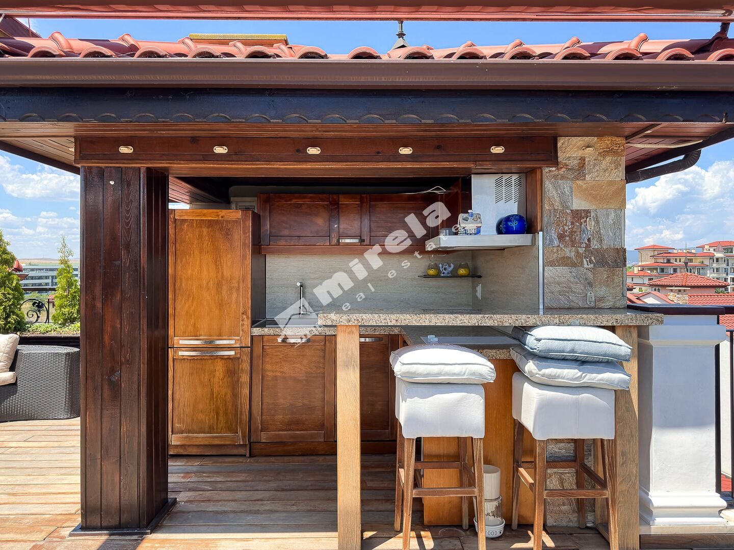 * Трето ниво: голяма тераса с кухня, електрическа тента, вградена в пергола, и уникални панорамни гледки.