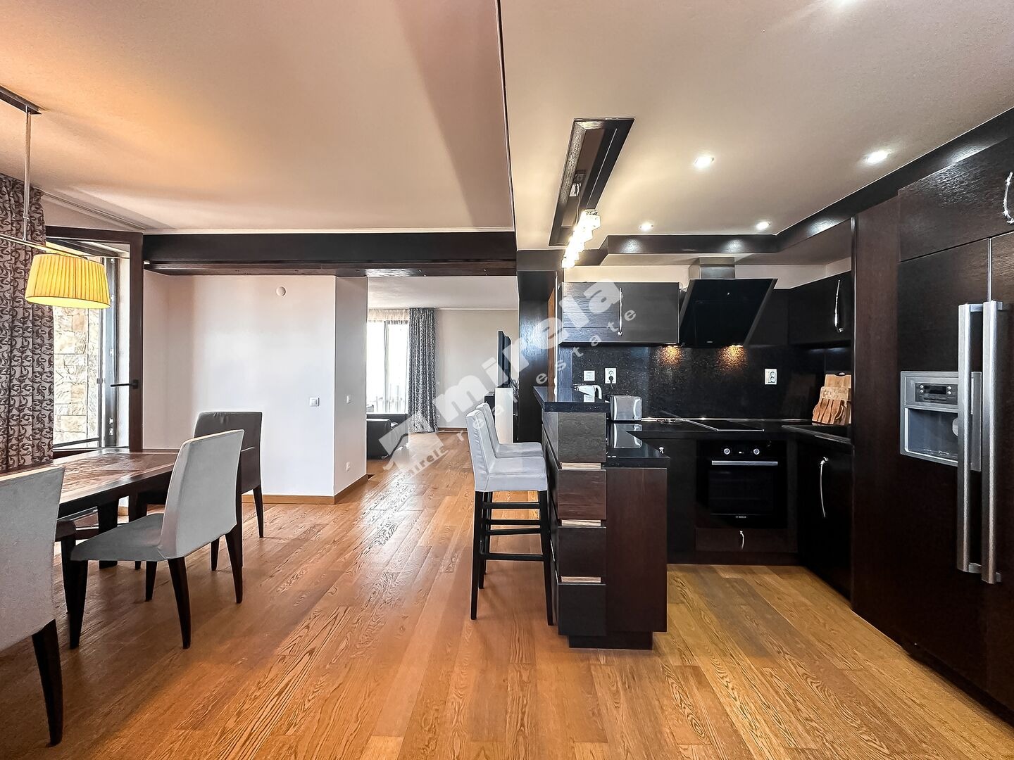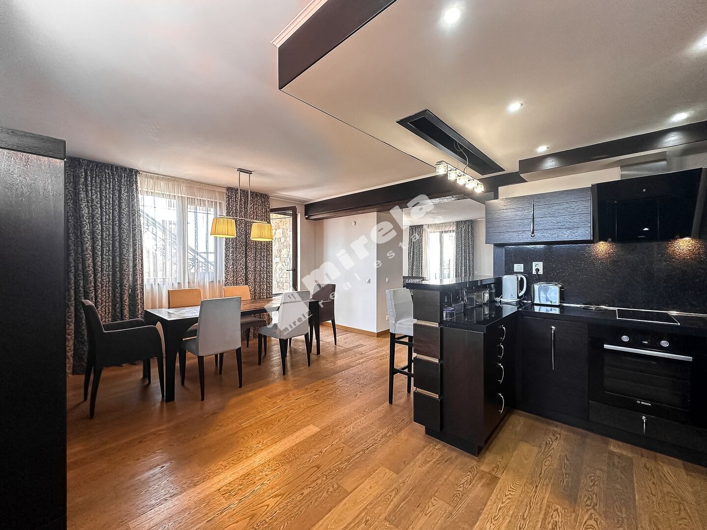 Апартаментът е оборудван с най-висококачествени уреди (мулти-сплит система Daikin, две кухни с уреди Bosch, шкафове от фина дървесина, дъбови подове, естествен гранитогрес в коридора, френски плочки в баните и първокласен санитарен фаянс).