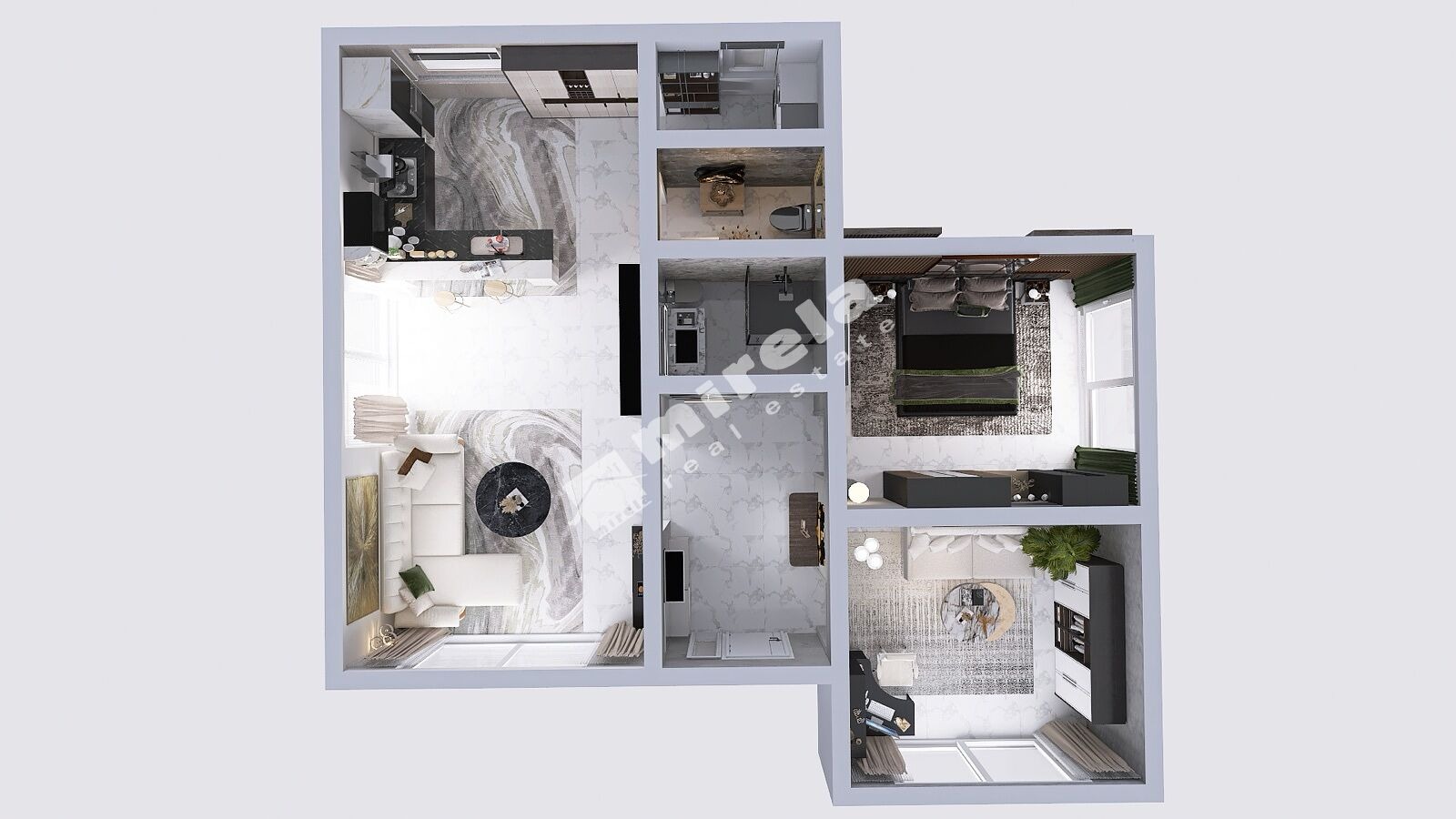 Разпределение: всекидневна с кухненски бокс и трапезария, склад с мокро помещение, две спални, баня с тоалетна, втора баня, веранда с панорамен изглед към морето.