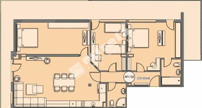 Състои се от дневна с кухненски бокс, три спални, две бани, просторен балкон.
