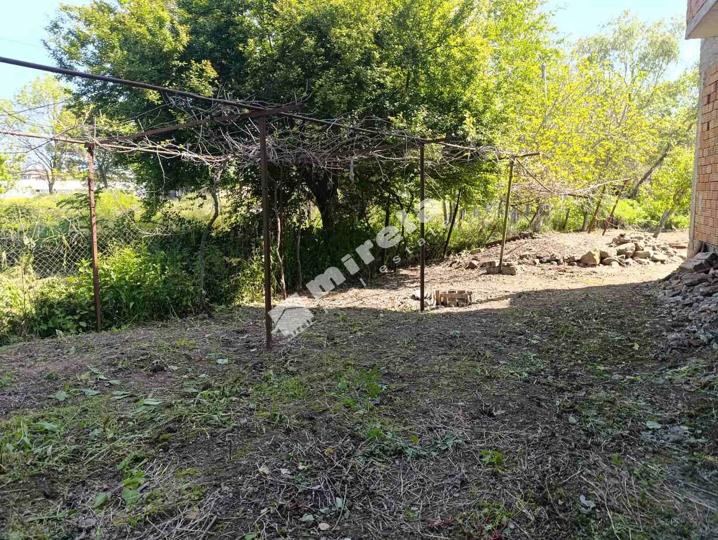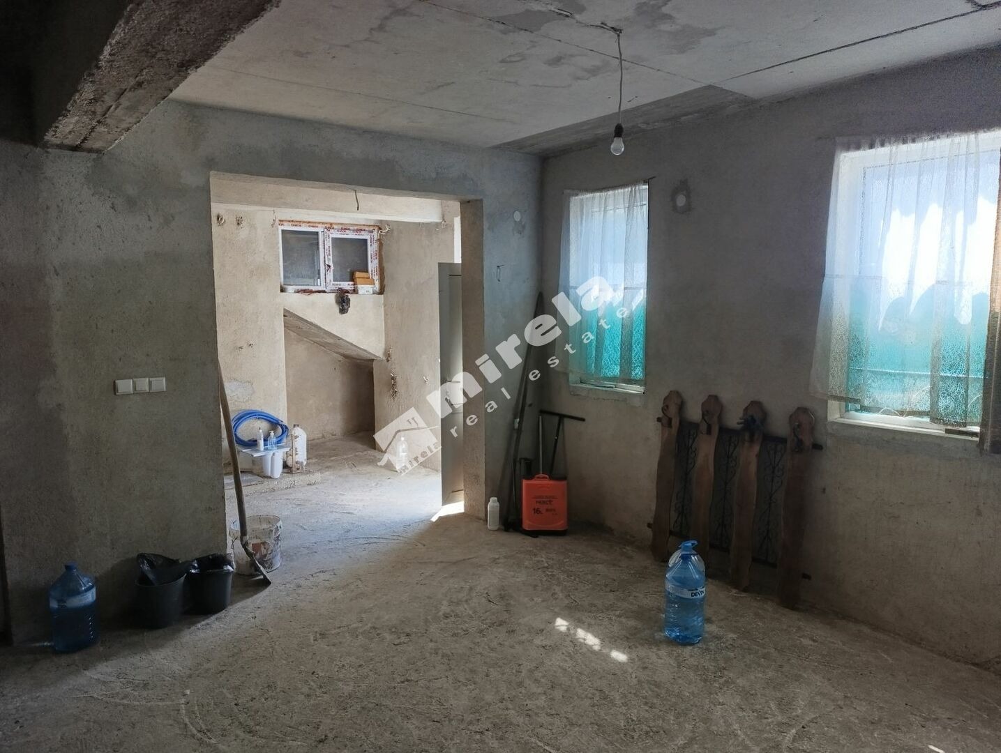 Първият етаж е в степен завършеност: под и тавани - бетон, стени - мазилка, монтирани ключове и контакти водопровод и канализация, окабеляване, дограма, интериорни врати.