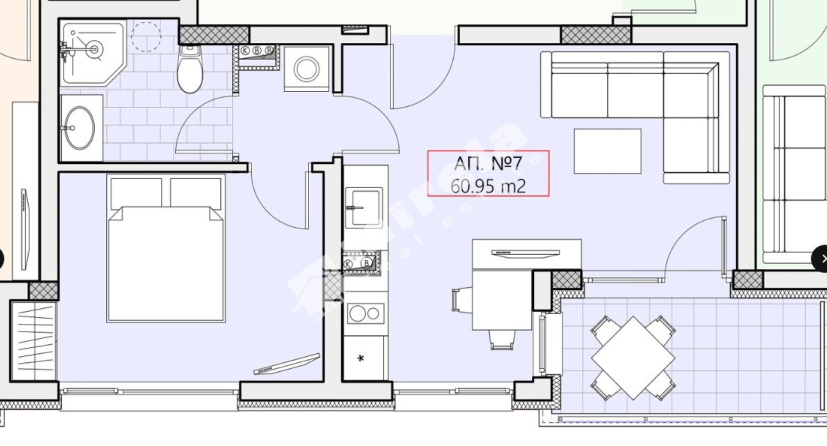 Има 1 балкон/тераса; Непреходен; ВИД СТРОИТЕЛСТВО: тухла; ЗАСТРОЕНА ПЛОЩ 51.40 кв.м; ИЗЛОЖЕНИЕ: юг; СПАЛНИ: 1; БАНИ: 1; ДОГРАМА: Алуминиева - лукс