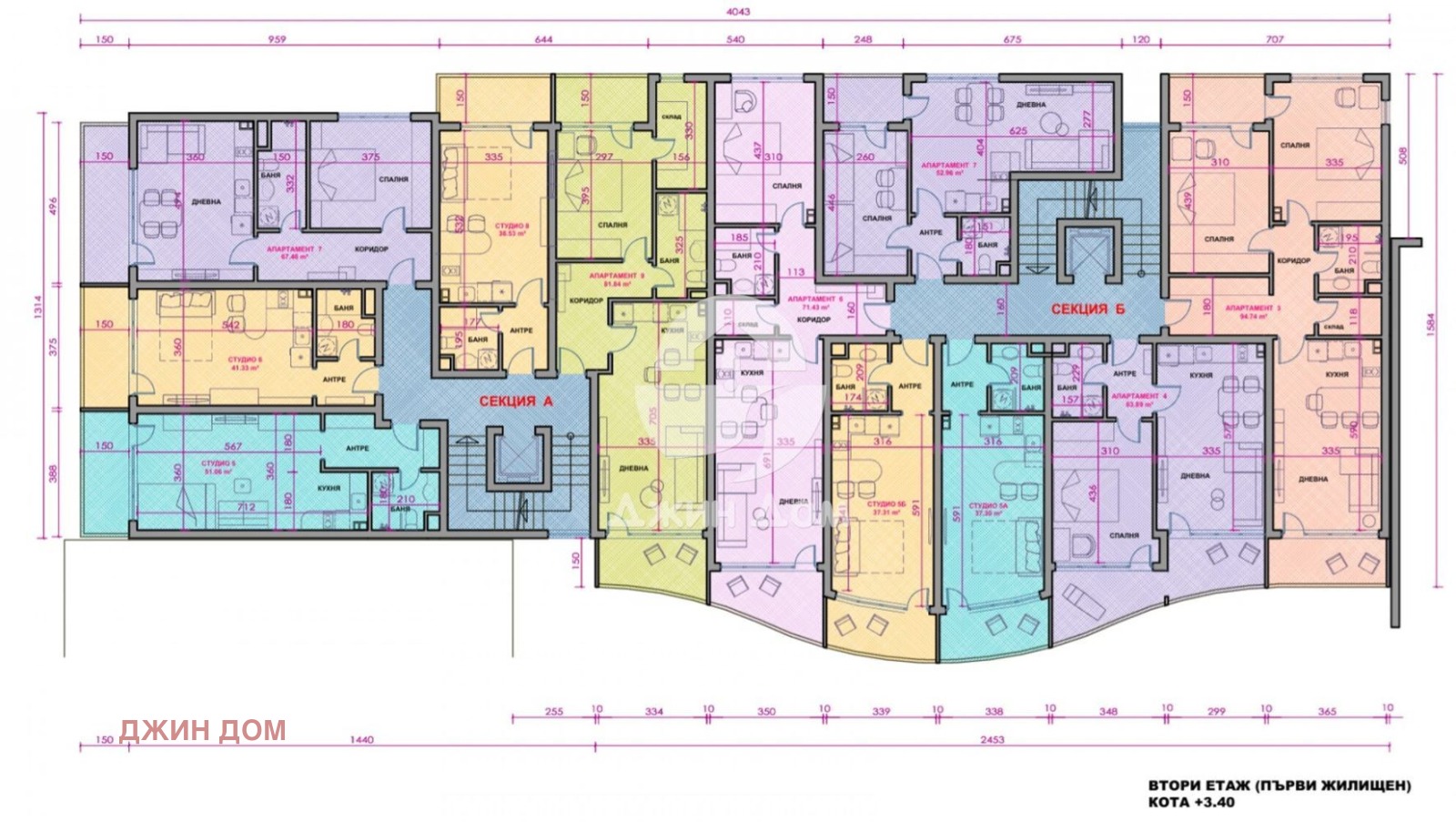 Жилището е с площ 43,67 кв.м и се намира на партерен етаж.