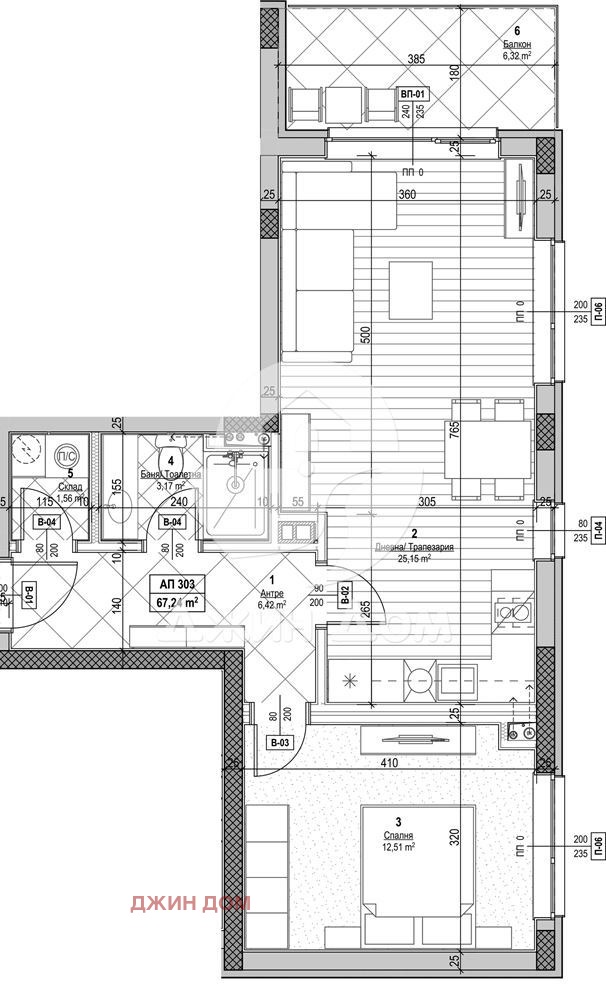 Апартаментът се състои от: антре, всекидневна с изводи за поставяне на кухня, спалня, баня, склад, тераса.