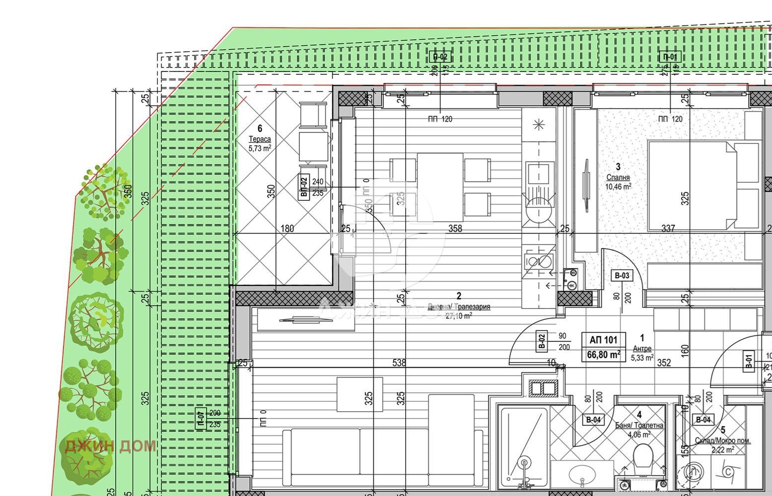 Апартаментът е с чиста жилищна площ 66.8 кв.м и се намира на партерен етаж.