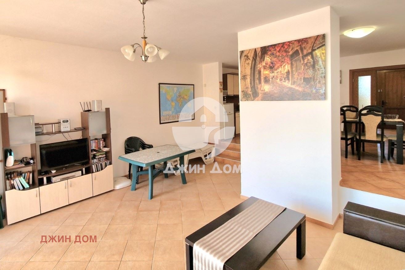 1 етаж: антре, просторен хол с кухненски бокс и трапезария, тоалетна, веранда с излаз към басейна в комплекса.