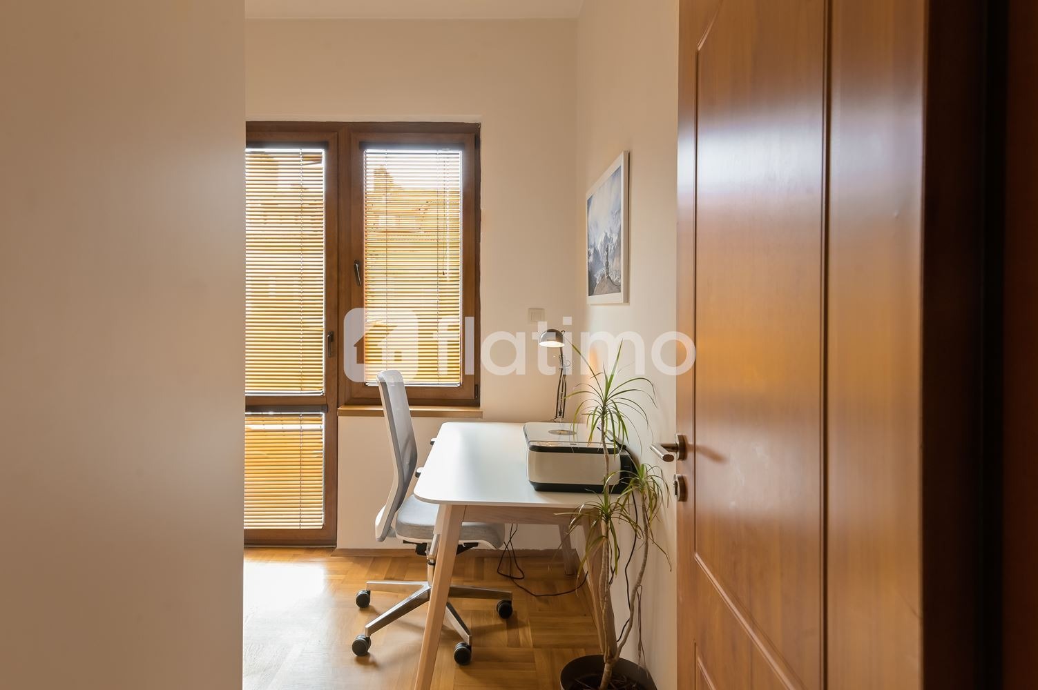 Офис стая- кабинет, който предлага: бюро и удобен офис стол; достъп до балкон с изглед към околността; сушилня и място за съхранение на вещи.