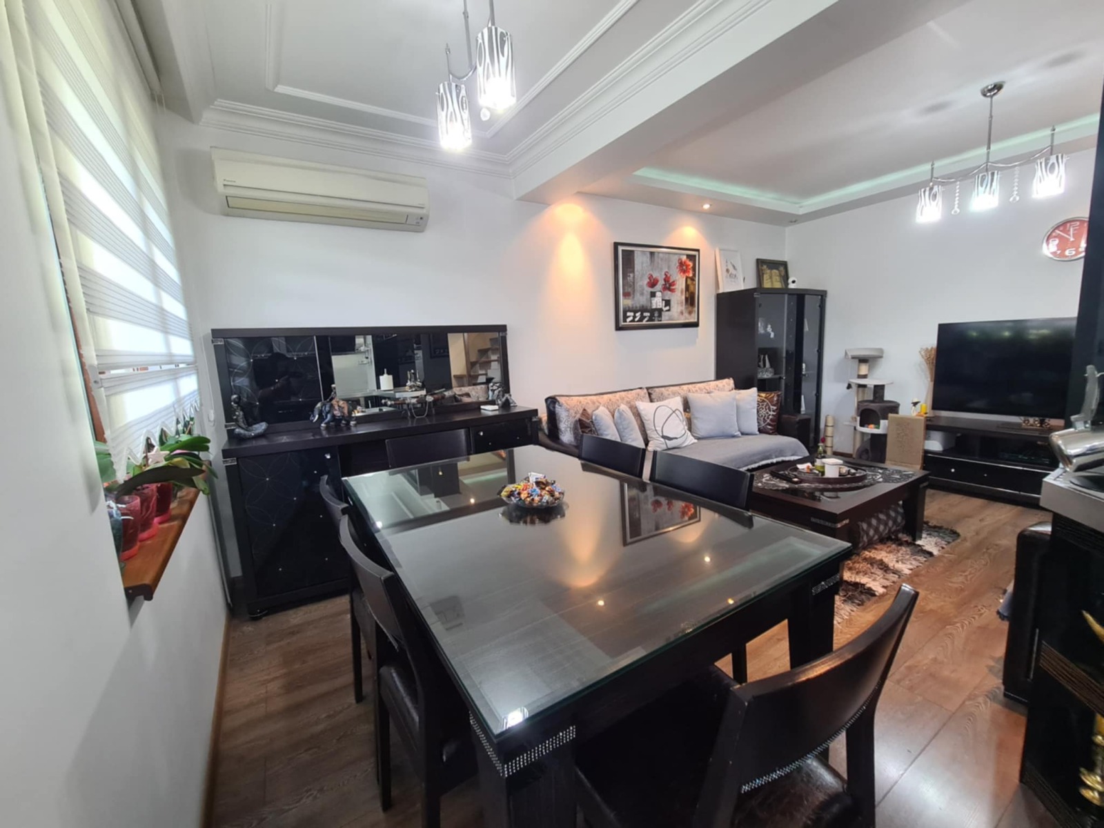 Светла и уютна всекидневна, съчетана с модерен кухненски бокс оборудван с вградени уреди, дизайнерски осветителни тела и гланцирани повърхности