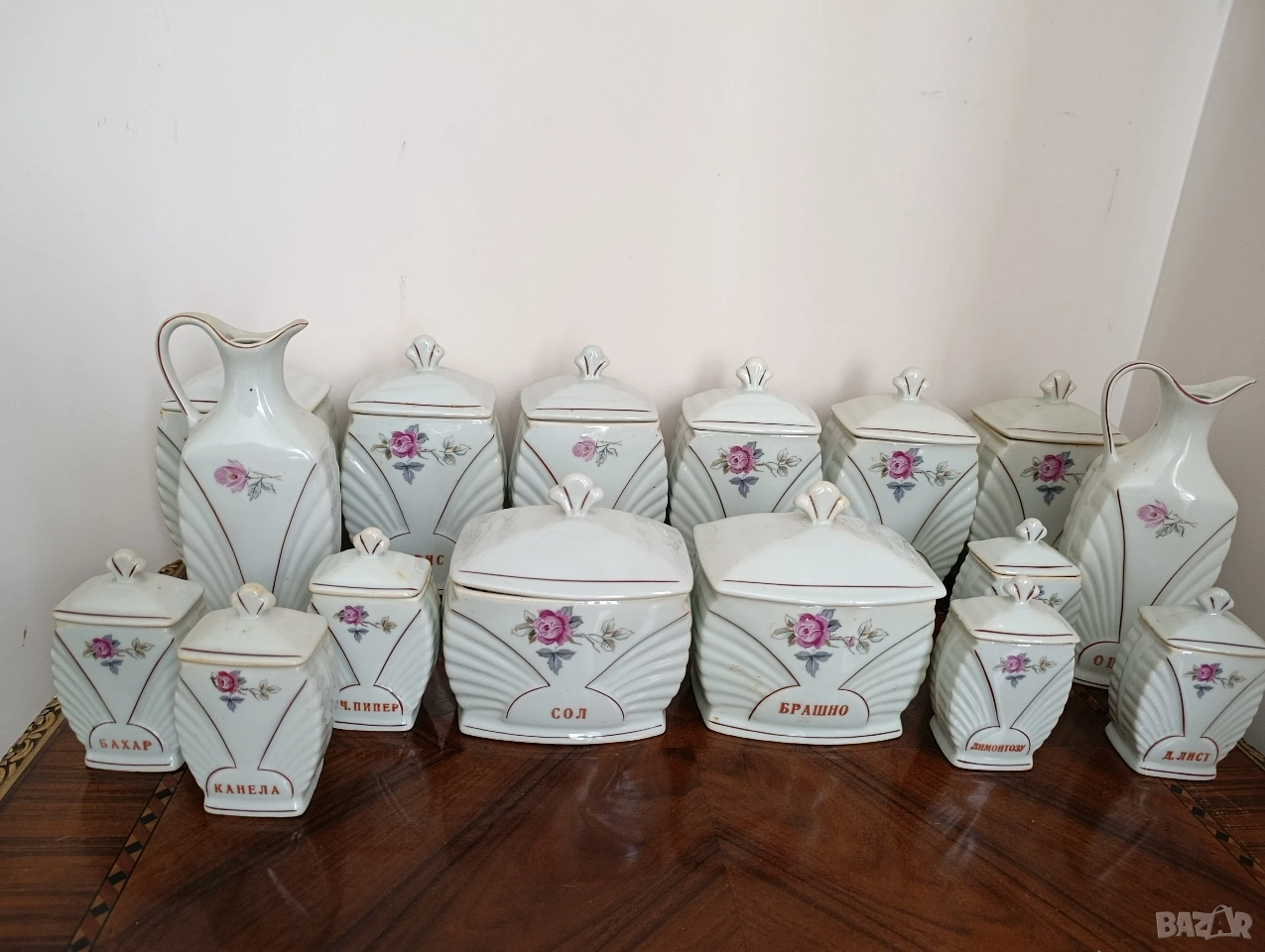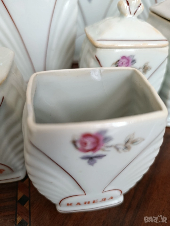 Буркани за подправки на Коста Йорданов -Видин . Ползвани ,запазени . Видно от снимките двете шишета (олио и оцет) са заменени с подобен декор ,както и един от големите буркани. Канела и брашно имат чипчета на ръба (на снимките ) .Цената не се коментира,не ги деля ,взимане само лично и от място.