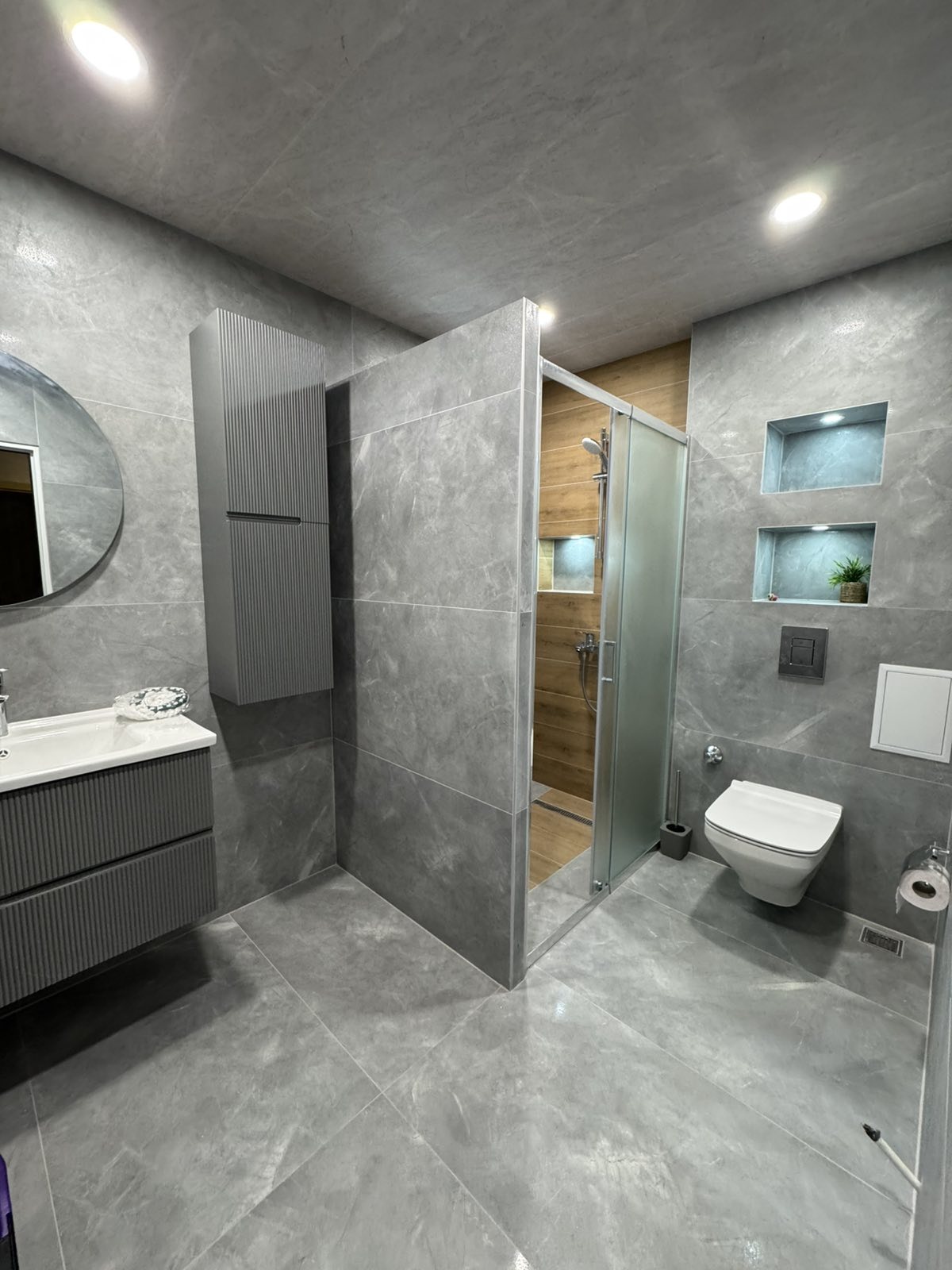 Проекта е реализиран с акценти до най-малкия детайл, посредством материали и оборудване от висок клас, както е представен на снимките. Мебелите са специално подбрани, материалите придават усещане за лукс и комфорт. Баните са довършени с висококачествени модели гранитогрес от водещи производители. Модерен кухненски бокс с материали и електроуреди от висок клас.