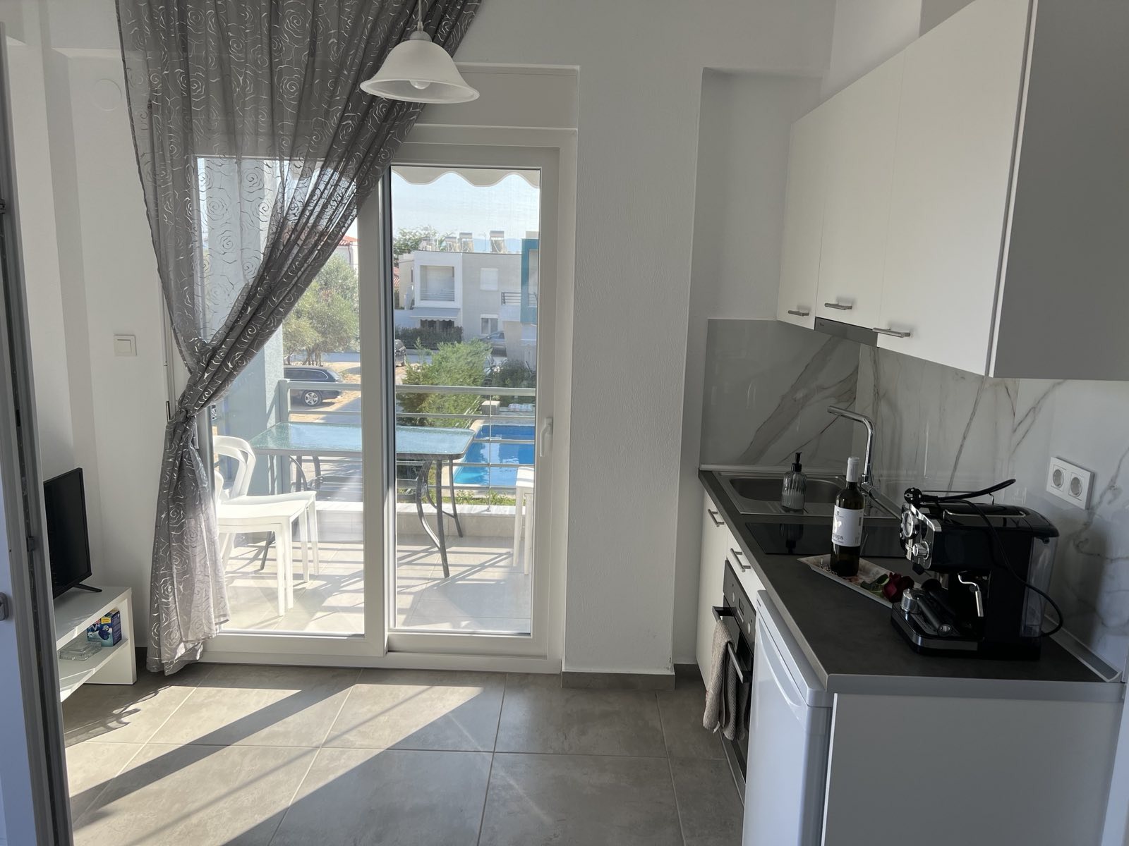 Продава се двустеан апартамент в Офринио. Жилището е на партерно ниво в малък бутиков комплекс с басейн и само на 400м. от морето.