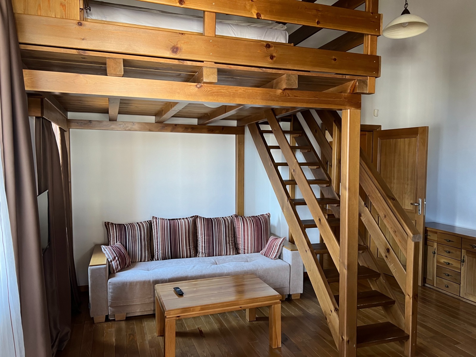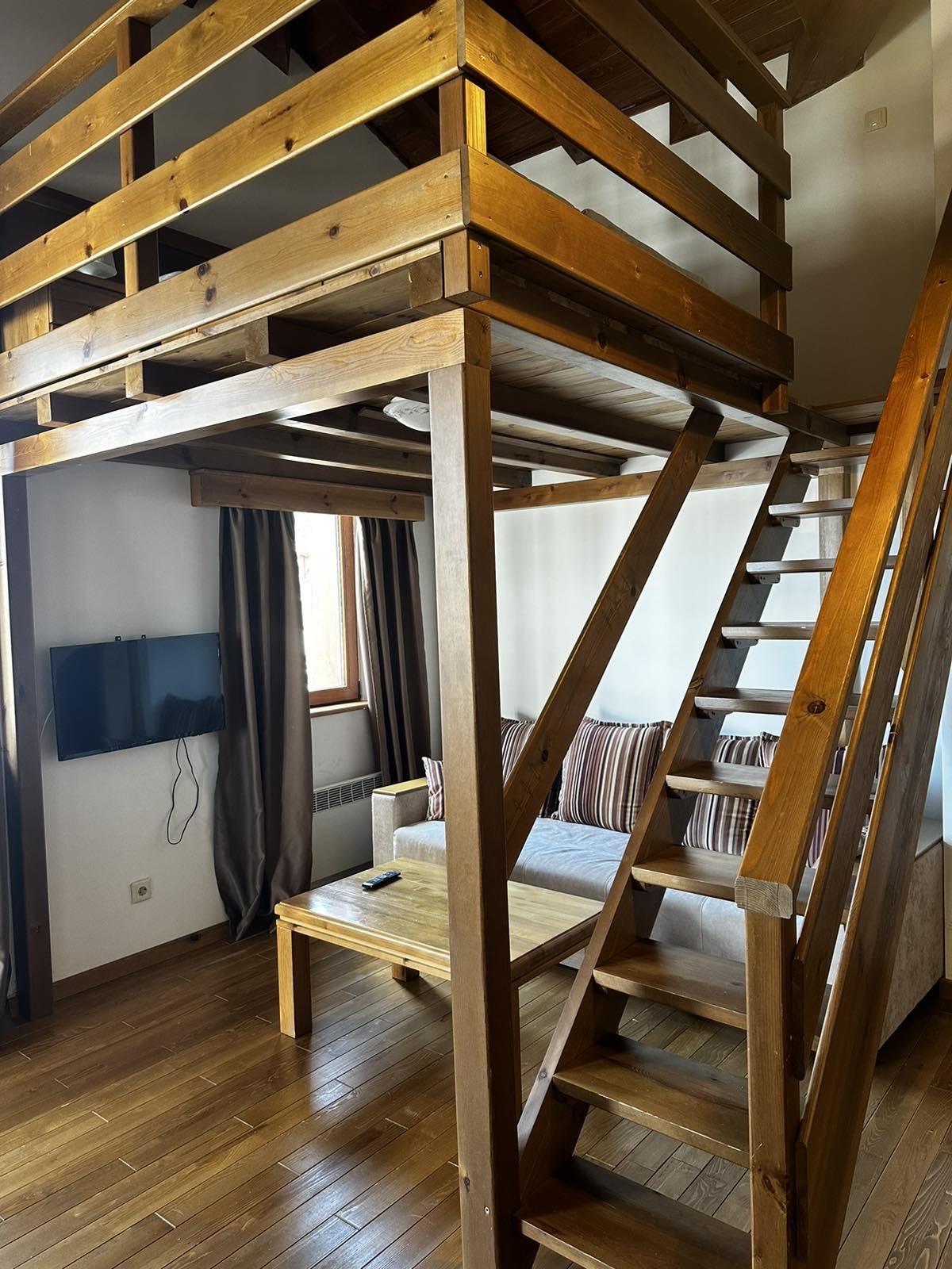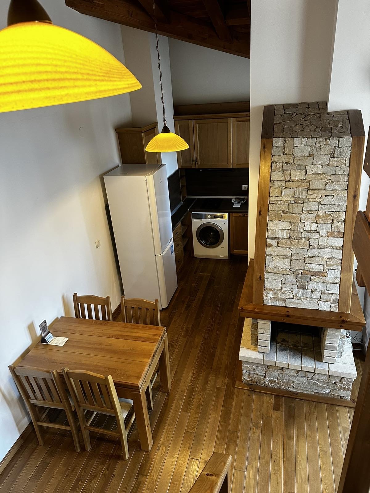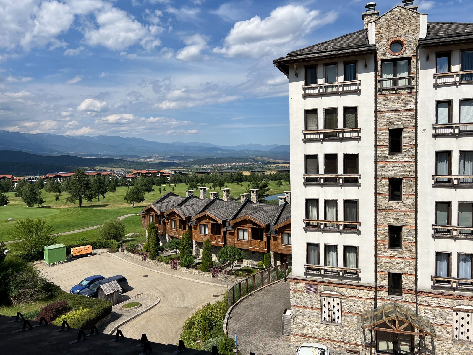 Жилището се намира на последен етаж, което осигурява спокойствие, повече светлина и впечатляващи панорамни гледки към Пирин планина, езерото и голф игрището.