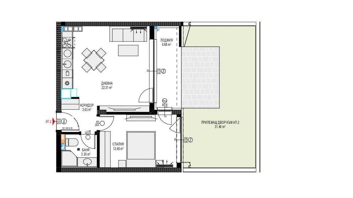 Жилището е разположно на партер и разполага с 32 кв.м частен двор! Състои се от входно антре, дневна, спалня, баня с тоалетна, балкон (лоджия) и 32кв.м частен двор!