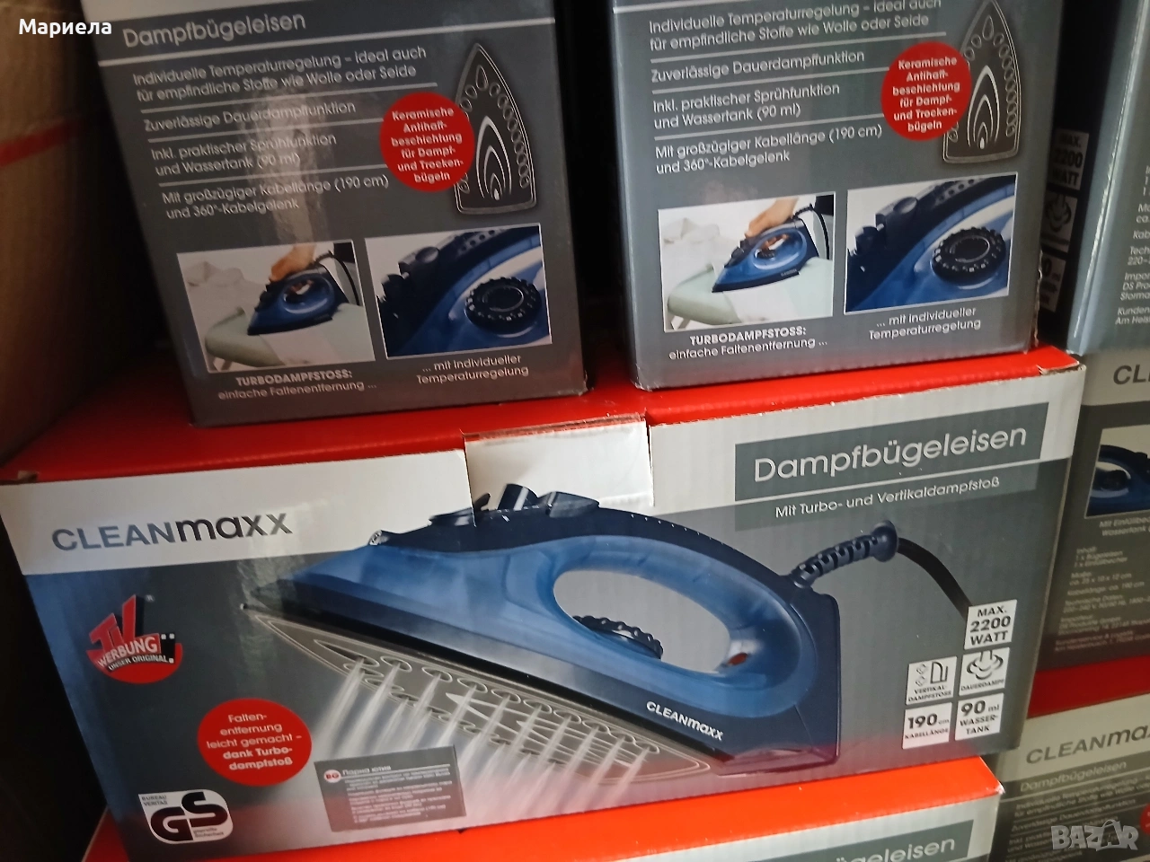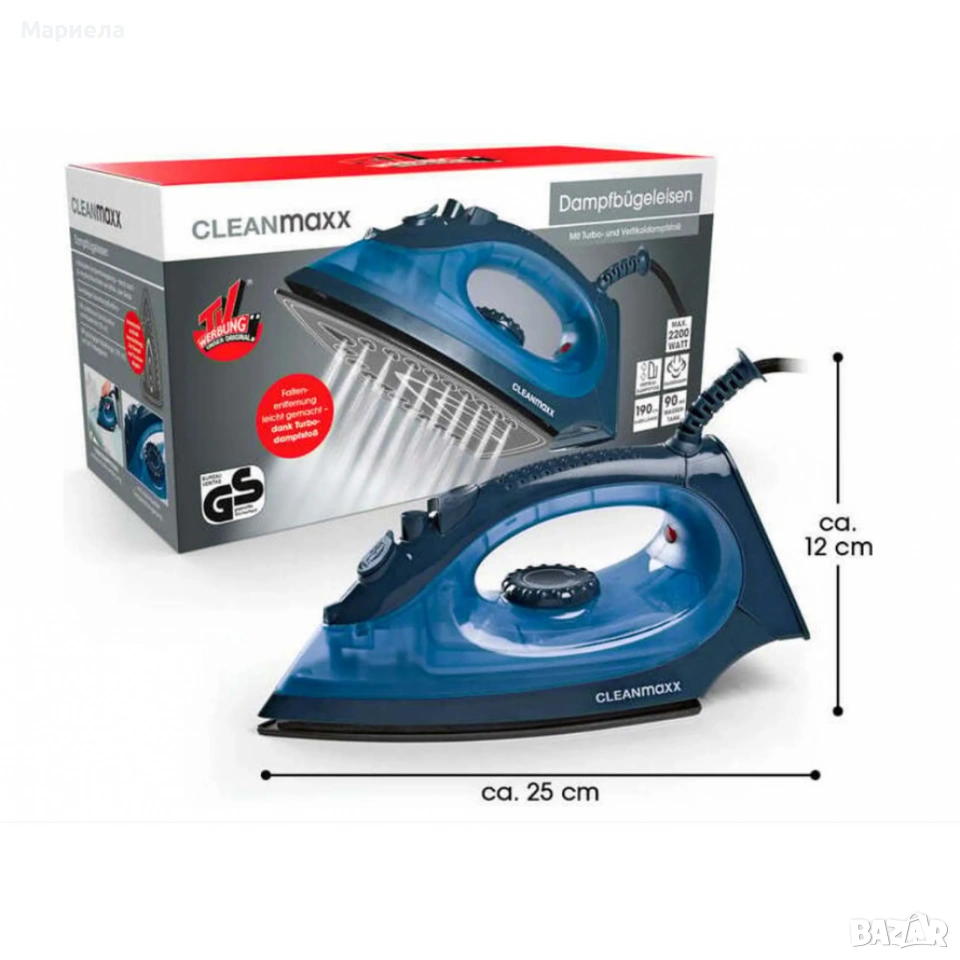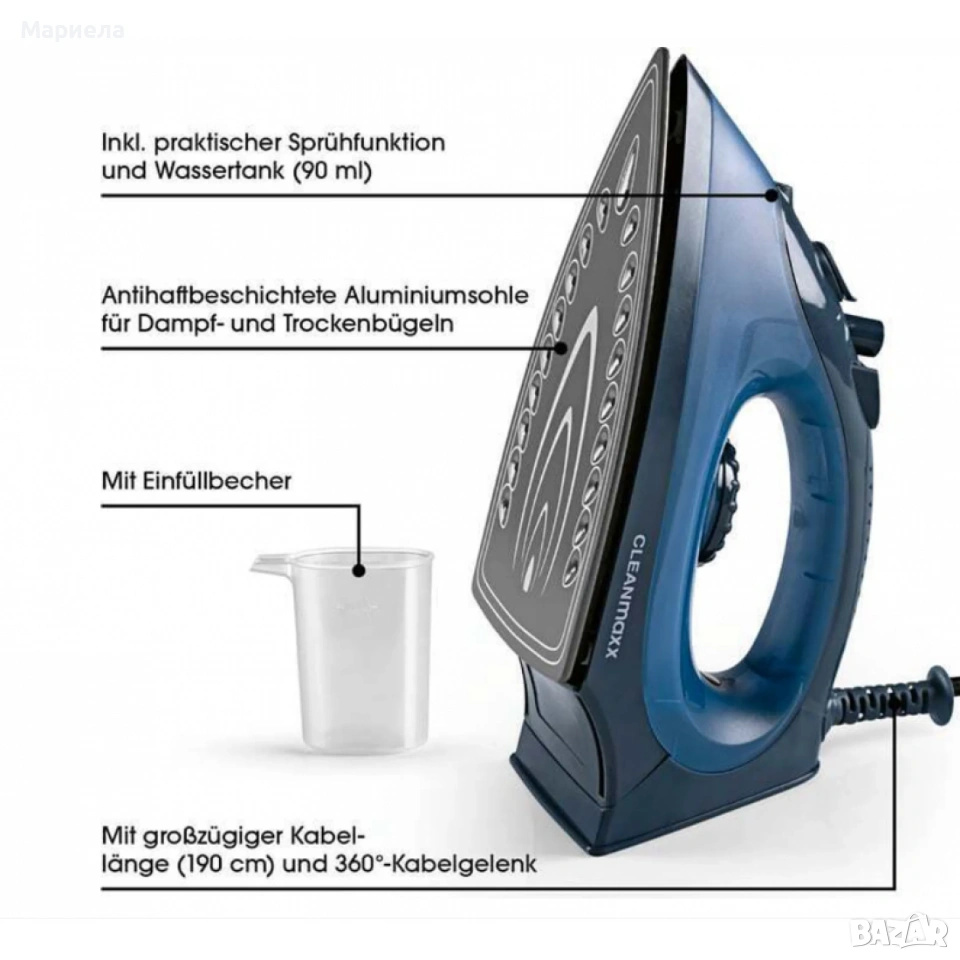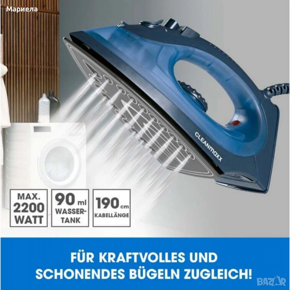Ютиите са нови закупени от Германия. Неотваря кутии. Изпращам с тест и преглед. Парната ютия CLEANmaxx CLEAN Edition предлага мощно и гъвкаво решение за вашите нужди от гладене. С мощност от 2200 вата, той загрява бързо и позволява гладене както на сухо, така и на пара.Керамичната гладеща плоча осигурява нежно гладене дори на деликатни тъкани като вълна и коприна. Големият резервоар за вода и функцията за вертикална пара го правят универсален, дори за окачване на дрехи и завеси. Акценти: - Индивидуален контрол на температурата и парата за различни видове тъкани - Голям резервоар за вода с капацитет 180 ml - 360° кабелна връзка и 1,9 m дължина на кабела за повече гъвкавост.