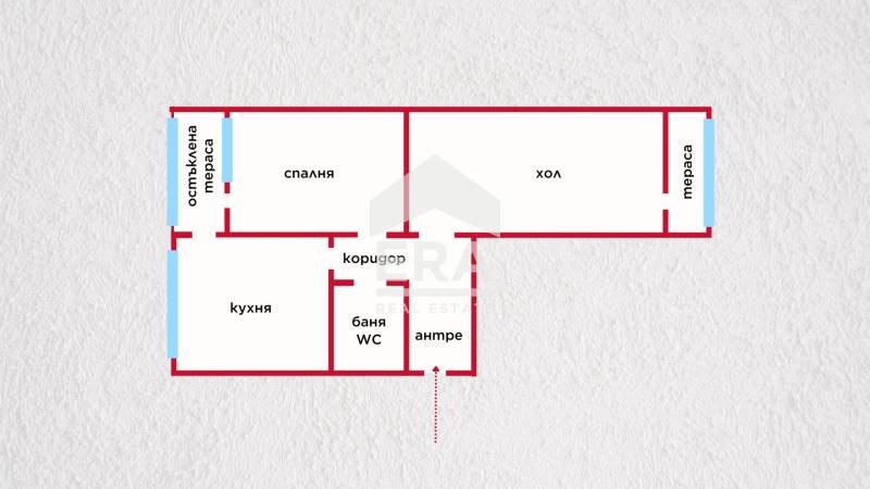 Има много добро функционално разпределение, състои се от входно антре, просторен хол, спалня, кухня, 2 просторни тераси, баня с тоалетна, таван и маза.