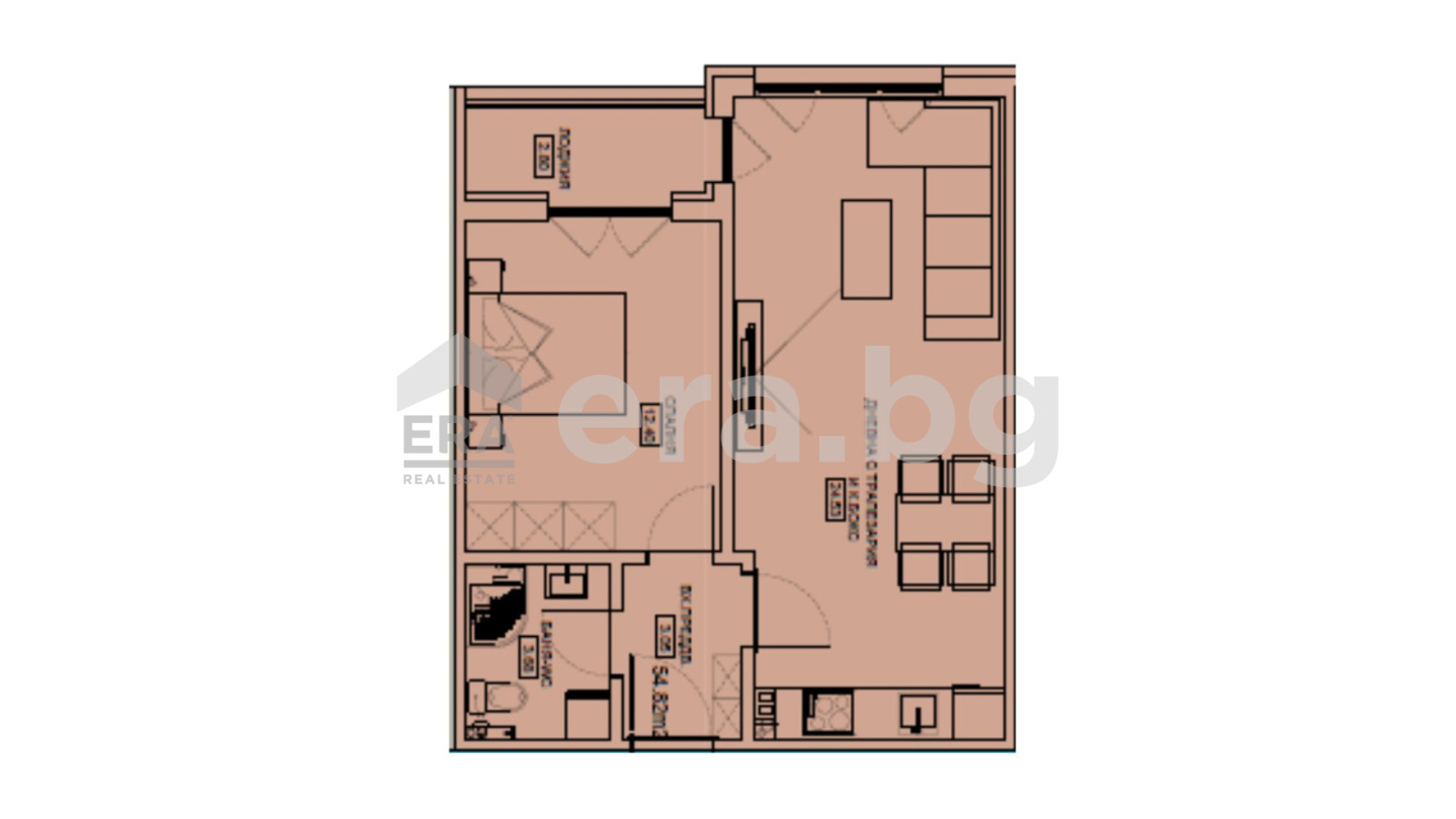 Апартаментът е с обща площ 63.56 кв.м. / от които 54.82 кв.м. застроена площ, 8.74 кв.м. (общи части от общите части на сградата), разположен на 3-ти жилищен етаж в триетажна жилищна сграда. Имотът има следното разпределение: просторен дневен тракт, трапезария и кухня - 25.44 кв.м., спалня - 12.40 кв.м., лоджия, входно антре, баня и тоалетна.
