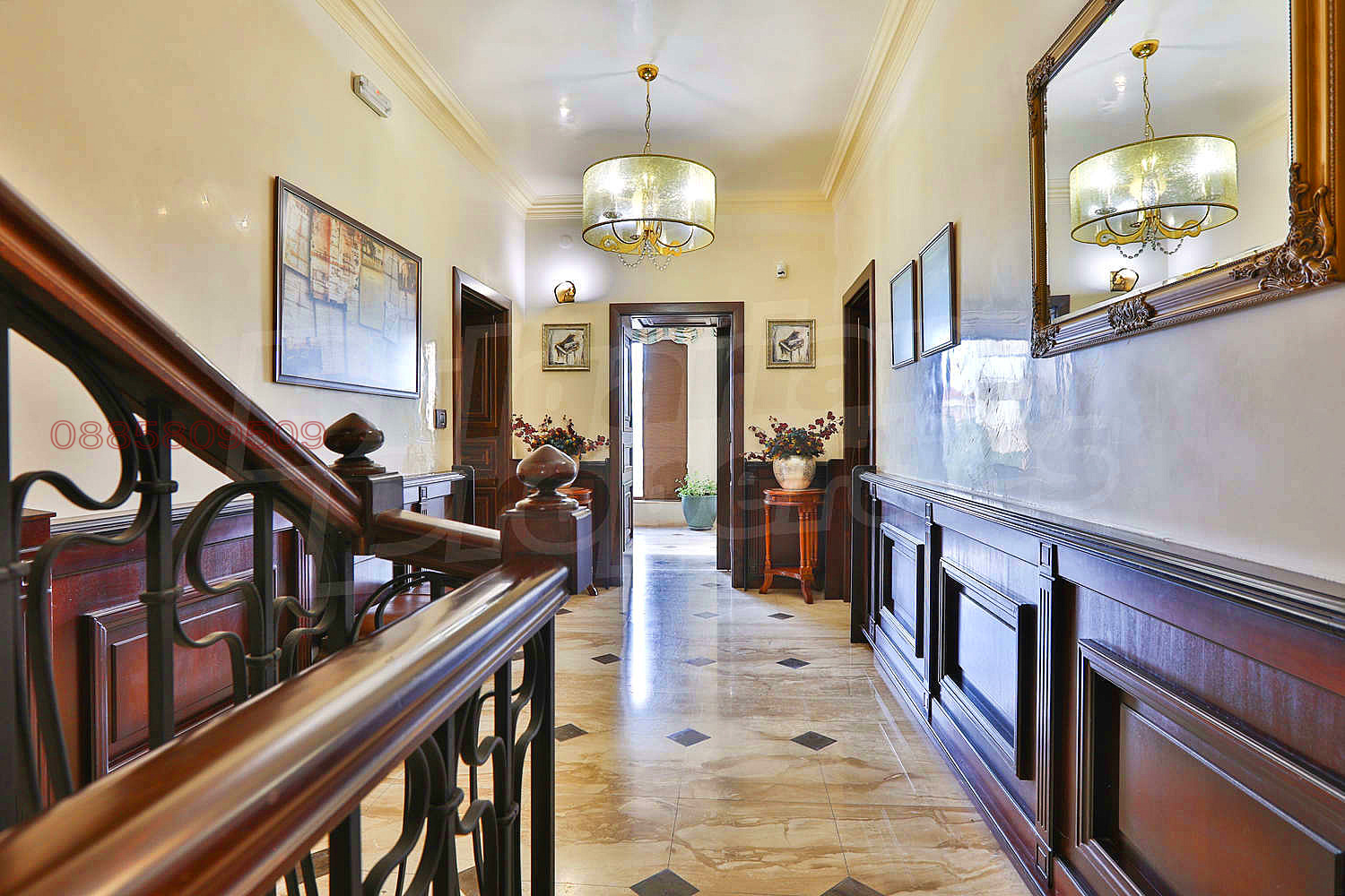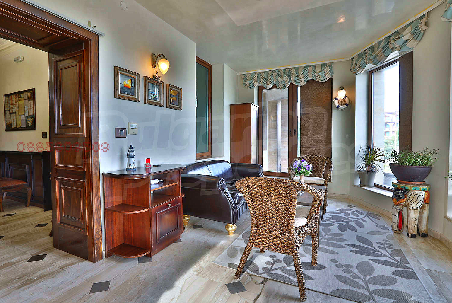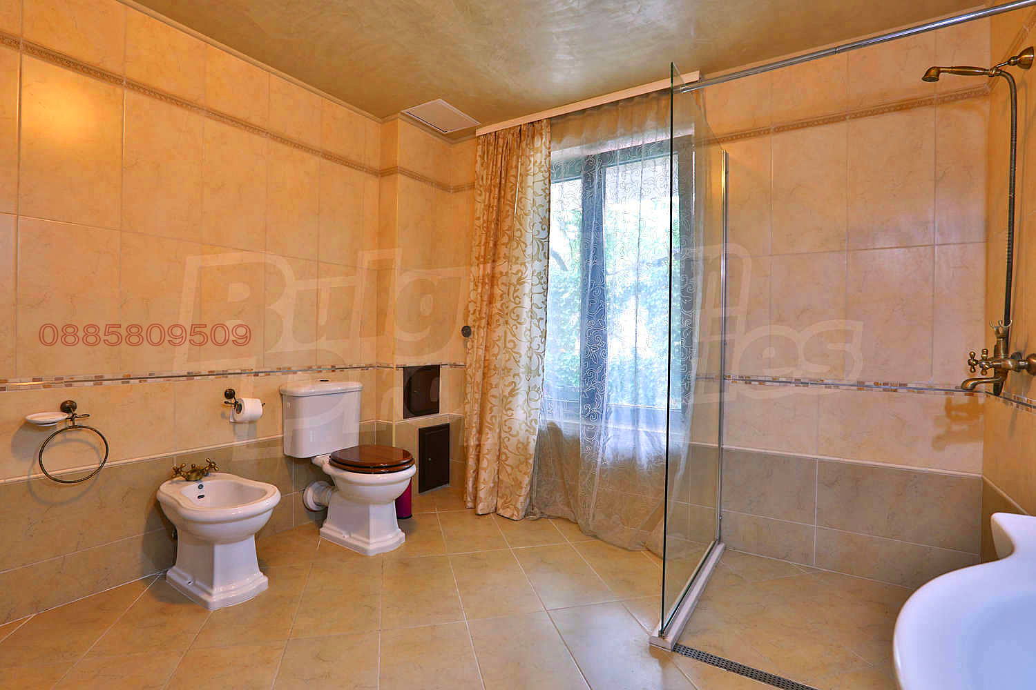 Изключително просторен и изискан дом със стилен интериор представен в 753 кв. м. чиста използваема площ и аранжиран двор от 1 129 кв. м., разположен в курортен комплекс ' Свети Свети Константин и Елена'. Къщата се състои от сутерен, първи, втори и мансарден етаж, луксозно завършени и обзаведени със селектирани виско-технологични материали и индивидуални дизайнерски решения. Със своите 7 спални, 6 бани и 3 хола къщата е подходяща за големи семейства, както и за техните гости. Допълнително удобство за релакс и комфорт внасят сауната, джакузи, външния басейн, библиотеката и зимната градина. За обитателите на къщата и техните гости са осигурени общо 6 паркоместа в двора. Топла вода се осигурява посредством бойлер със селективни соларни панели, захранващи цялата къща. Къщата е включена към канализационната система в района. Разпределение: