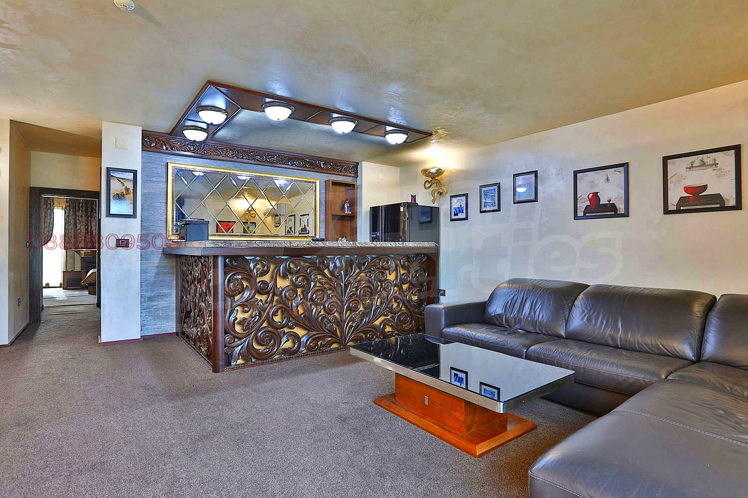 -Хол-просторно помещение покрито с родезийски тик, стилна италианска мека мебел, барплот от ръчно направена дърворезба, завеси от дизайнерски текстил.