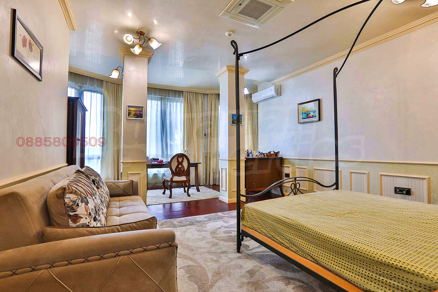 -Спалня 2- френски прозорци с оригинална форма на трапец немска пет камерна PVC дограма с трислоен стъклопакет, подова настилка от родезийски тик, обзавеждане от масив и ковано желязо.