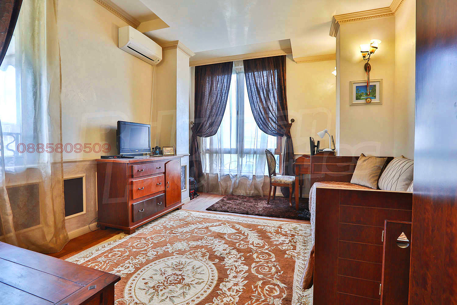 - Спалня 3 /родителска/ към спалнята има тераса и гардеробно помещение. Подовата настилка на спалнята е от плътен дизайнерски мокет. Обзавеждането на спалнята е от масив.