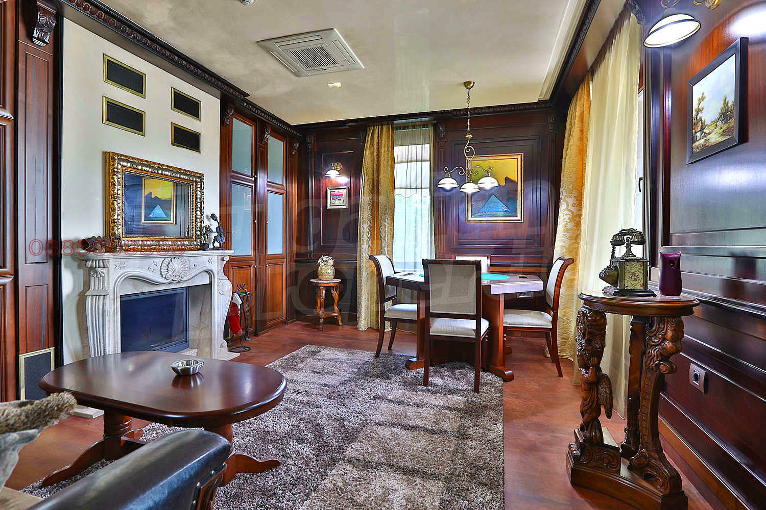 -Хол-библиотека с камина от мраморна облицовка от Италия. Облицовка на стените от масивно дърво, маса за игра на карти, канапе, подовата настилка на помещението е от родезийски тик, завеси от дизайнерски текстил.