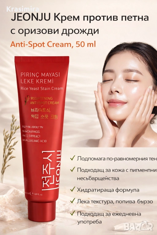 Предлагаме JEONJU Rice Yeast Stain Cream – крем за лице с лека текстура, създаден за ежедневна грижа и по-равномерен вид на кожата.