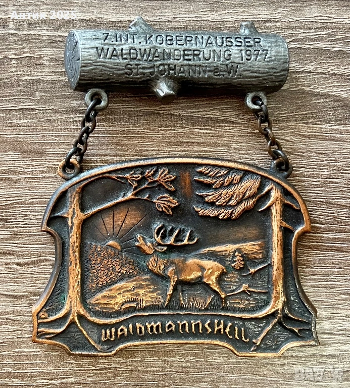 Оригинална винтидж нагръдна значка (паметен медальон) от Германия, посветена на горски поход Waldwanderung 1977 в град Санкт Йохан. Изработена от метал с бронзово покритие, в ловен стил – релефно изображение на елен, горски пейзаж и надпис „Waldmannsheil“ (традиционен ловен поздрав).