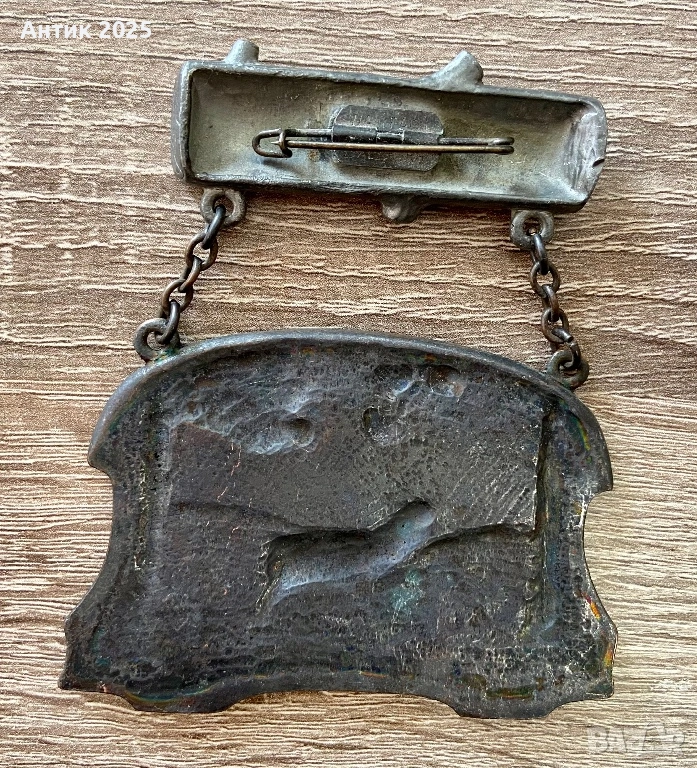 Тежка и масивна изработка с добра детайлност и естествена патина от времето. Подходяща за колекционери, любители на лова и туристически значки. Много добро състояние.