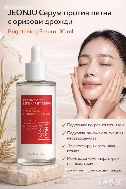 Предлагаме JEONJU Rice Yeast Anti-Blemish Brightening Serum – лек и бързоабсорбиращ се серум за ежедневна грижа за кожата.