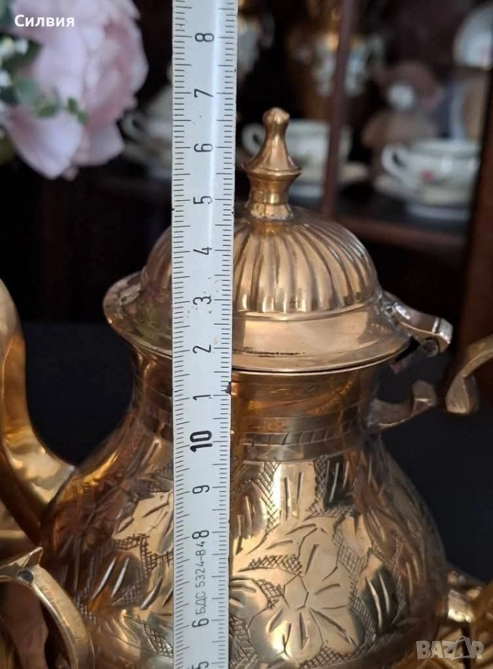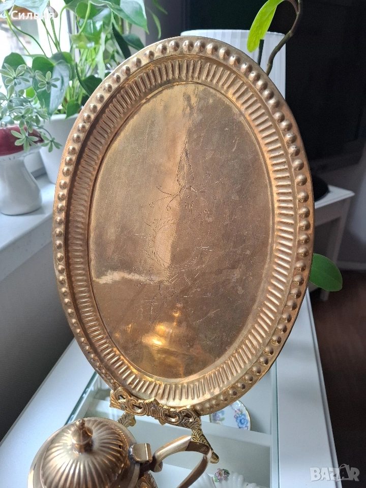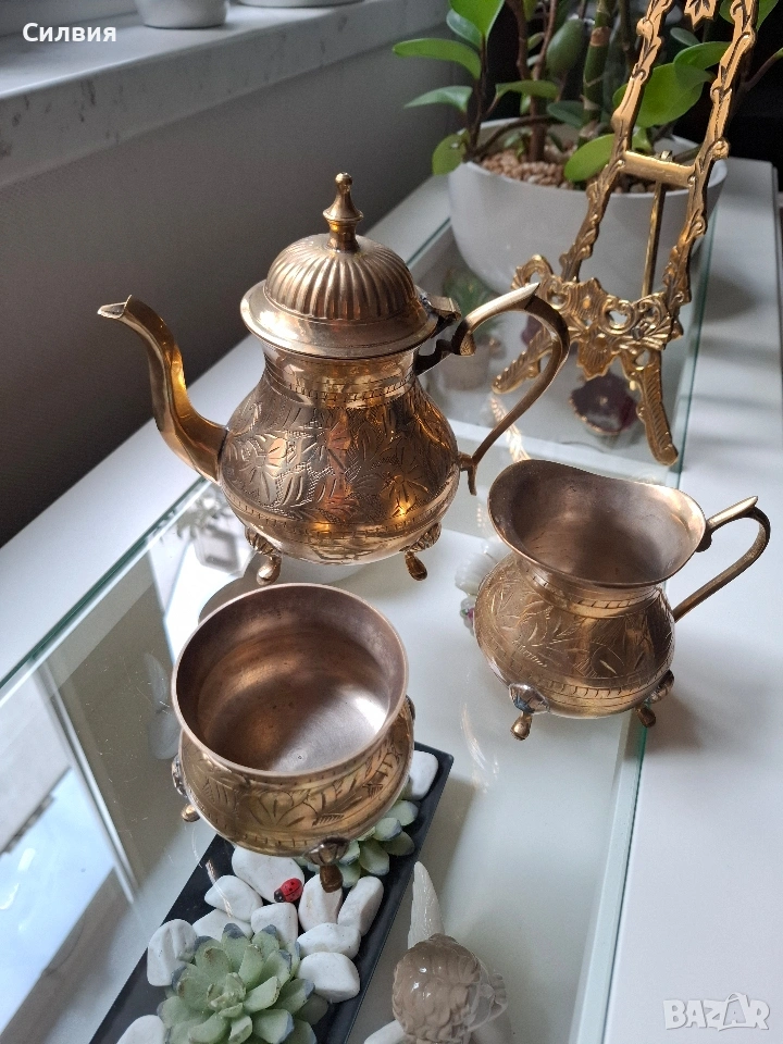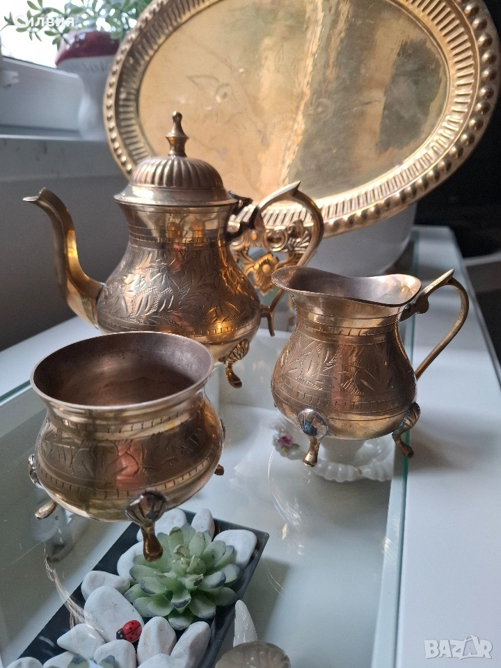 Винтидж, месинг, комплект от 4 части: Включва: ■Овален поднос (33/23см) ■Чайник/кафеник, ■Каничка-сметана,мляко. ■Захарница- всичко с ръчна гравюра и изящна орнаментика. От масивен златист месинг, гравирани и хубави крачета за стоене. Красив комплект с изразена ориенталска естетика, с богата флорална украса и елегантни извити крачета, които придават усещане за изтънченост и класа. Подносът е с релефен борд и фин флорален мотив в центъра. 🔸 Материал: масивен златист месинг 🔸 Стил: / ретро / винтидж 🔸 Ръчна изработка и гравюра 🔸 Подходящ за декорация, подарък или колекция. Сервизът е в много добро състояние за възрастта си – с естествена патина, която подчертава автентичността му. Чудесен акцент за интериор в стил бохо, класически или еклектичен. Цена 8️⃣0️⃣€ 156,47лв ,ೋ🌷 ೋ🌷 ೋ🌷