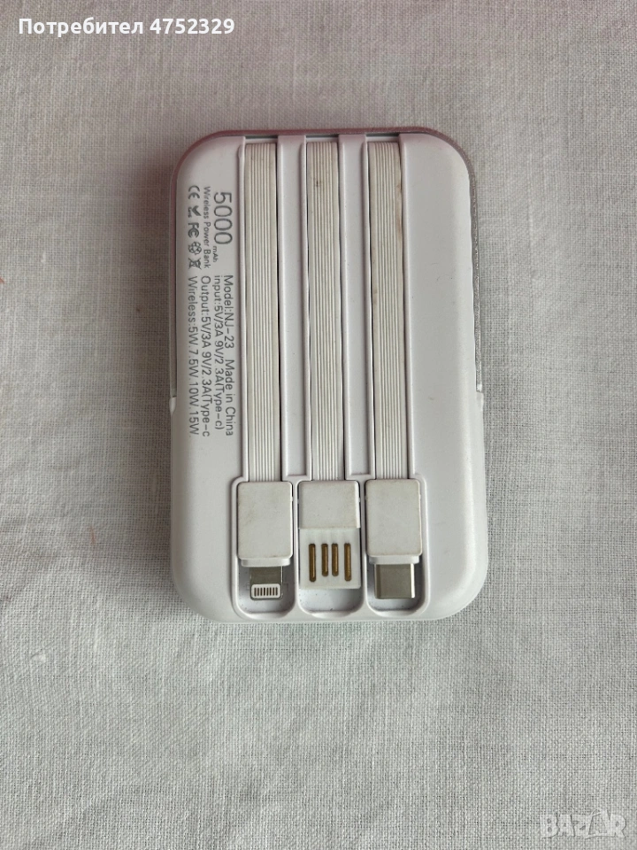 преносима безжична батерия с 3 различни кабелчета за всички телефони