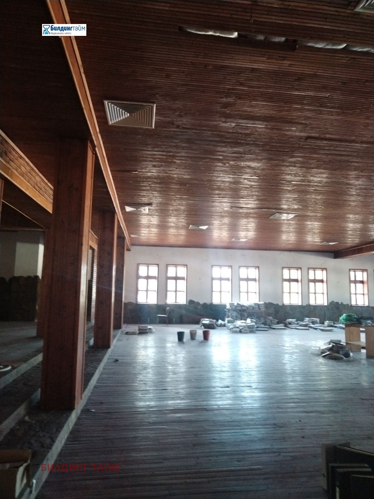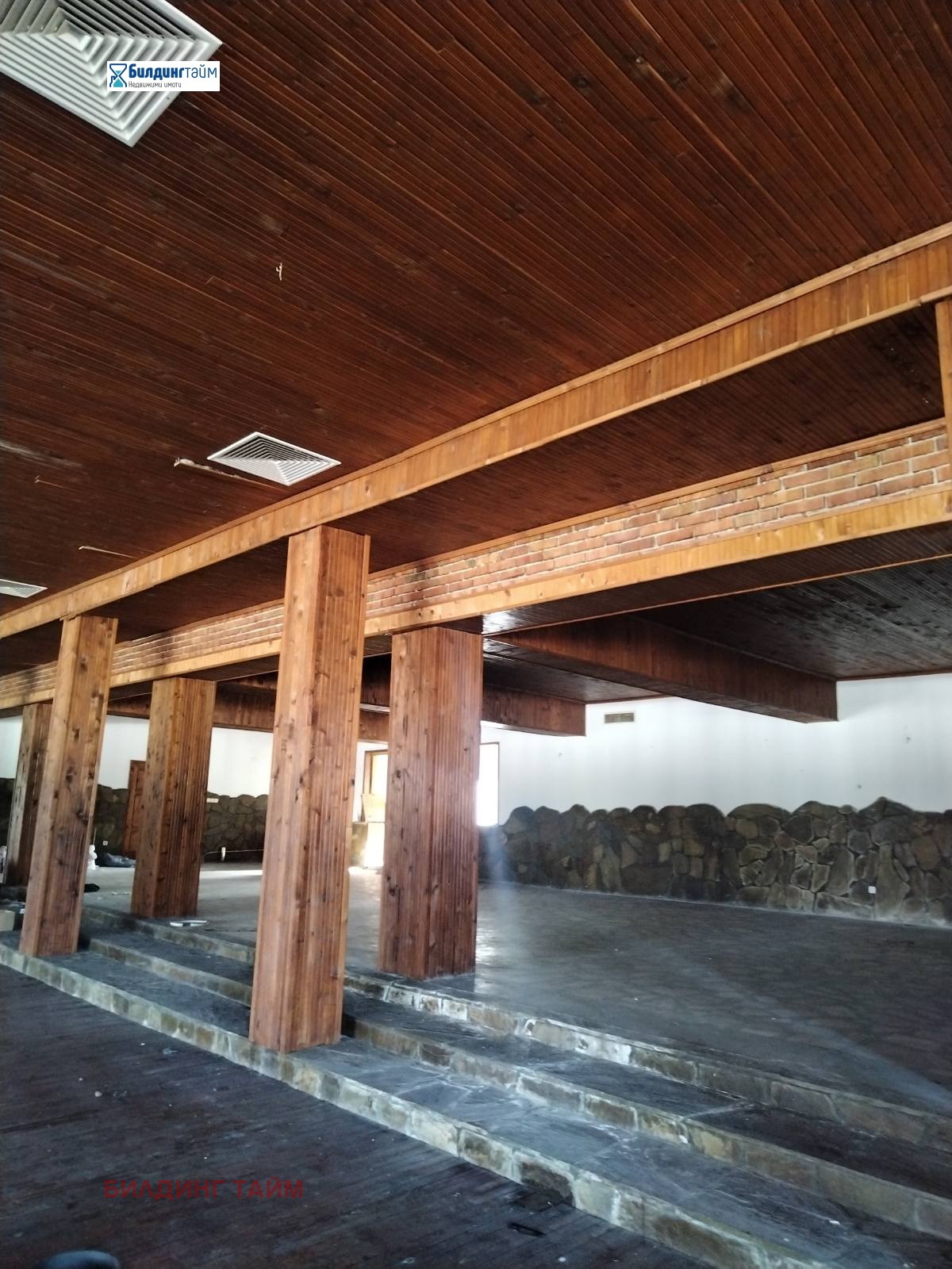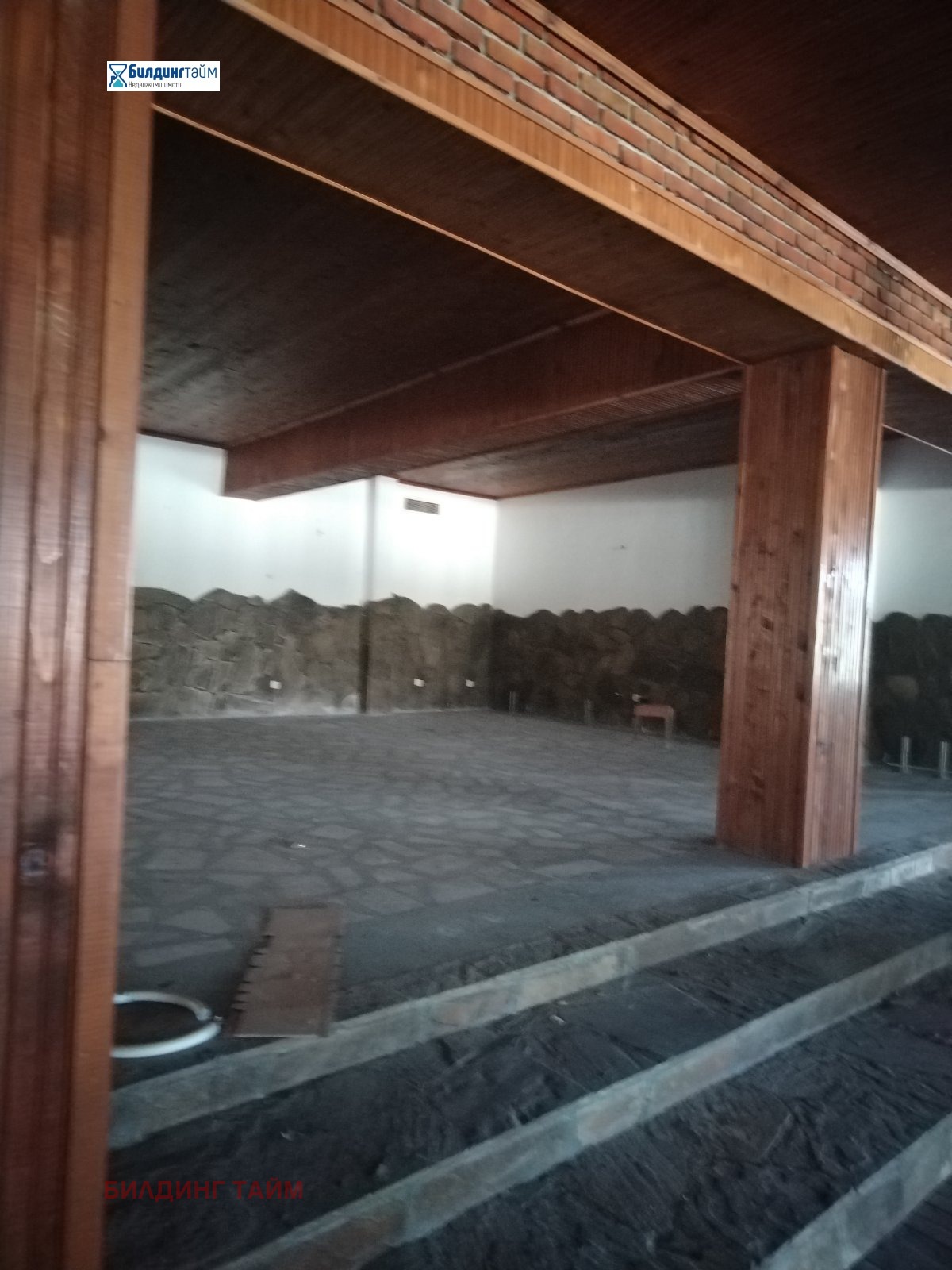 Помещенията се отдават заедно или само това от 400 кв.м. Помещението от 400 кв.м. е с дървен под и облицован с дърво таван. Помещението от 90 кв.м. е с под циментова мозайка и облицован с дърво таван. Сградата е масивна.