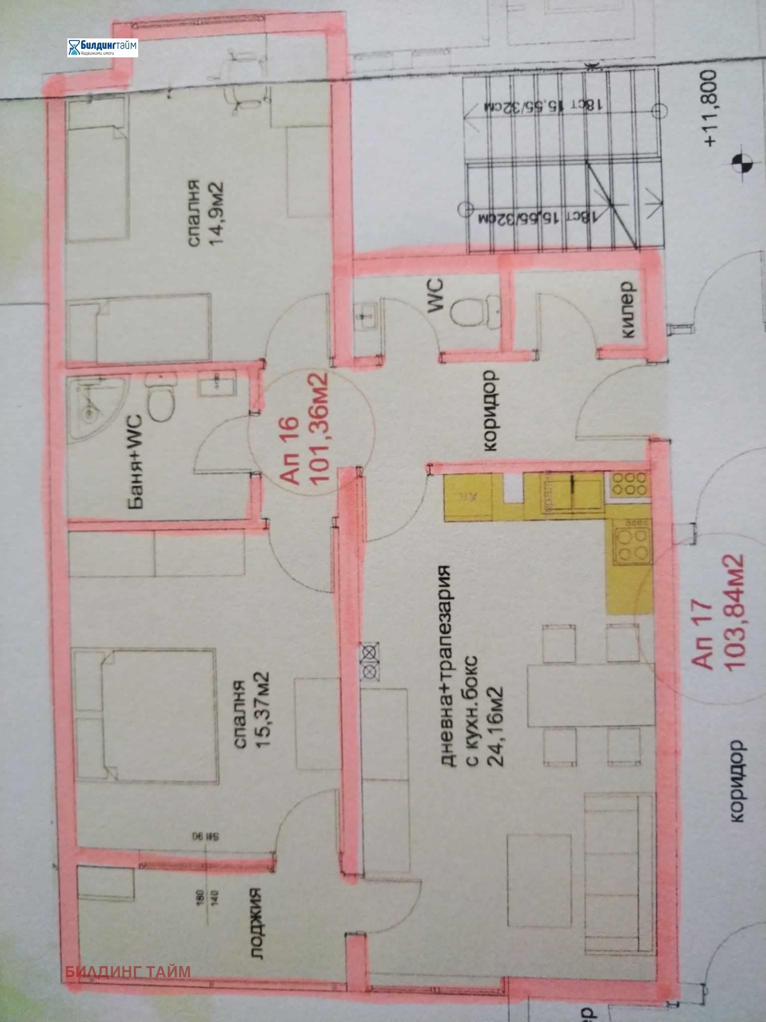 Дневна-трапезария с кухненски бокс /25 кв.м./и спалня / 16 кв.м. /на юг с обща тераса-лоджия. Втора спалня/ 15 кв.м. / на север. Жилището разполага с две санитарни помещения / баня с тоалетна и тоалетна отделно / и килер. Общата площ на апартамента е 101,36 кв. м. Изложението е юг-север.