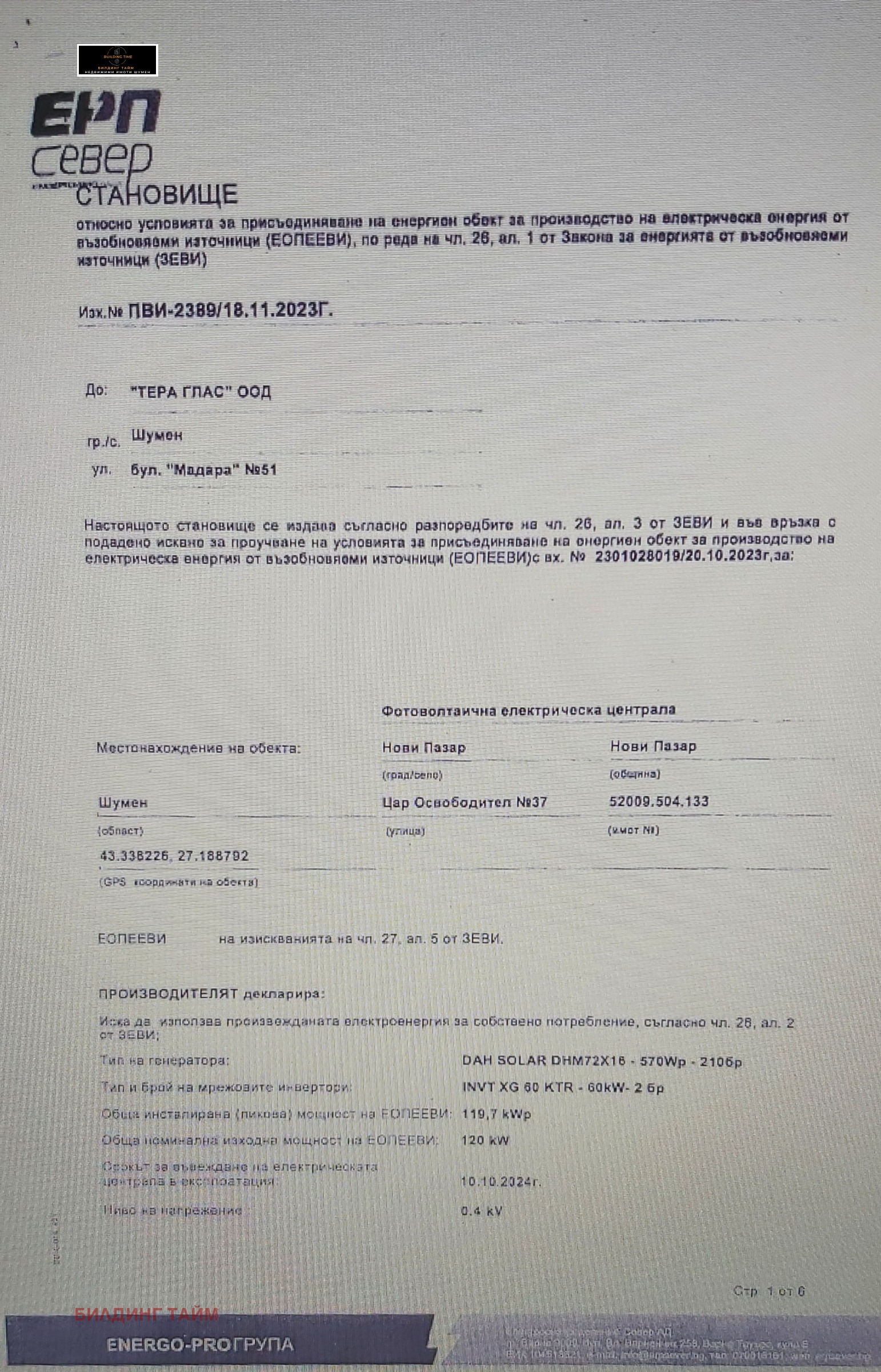 Производствено-складова база, предприятие построено през 1987. Имотът се намира в централната индустриална зона на самия входен булевард на гр. Нови Пазар. В близост има ж.п. линия и автогара. Парцелът в който са построени сградите е с площ 8061 кв.м. с трайно предназначение на територията урбанизирана и начин на трайно ползване за друг вид производствен, складов обект.Сградите в имота са 13 на брой със ЗП 2735 кв.м. Три от постройките са на 2 етажа като и с тях общата РЗП е 3368кв.м. Вторият етаж се ползва за администрация и офиси.Имотът разполага със собствен трафопост със ЗП 27 кв.м. с мощност 120 киловолта. Имотът е газифициран и има три кладеница с промишлена вода. В двора, на входа на имота има покрит паркинг - 150 кв.м., разполага и с товаро-разтоварни рампи. Има красиво озеленен двор и поддържани общи части Има издадено СТАНОВИЩЕ от ЕРП-север за присъединяване на енергиен обект - създаване на фотоволтаична ел. централа с мощност 140 kWp.