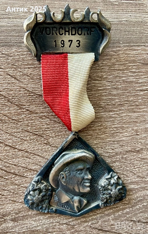 Оригинална австрийска туристическа значка от 1973 г. с надпис „Vorchdorf 1973“. В долната част е изобразен релефен портрет на Luis Trenker – известен австрийски актьор и алпинист.