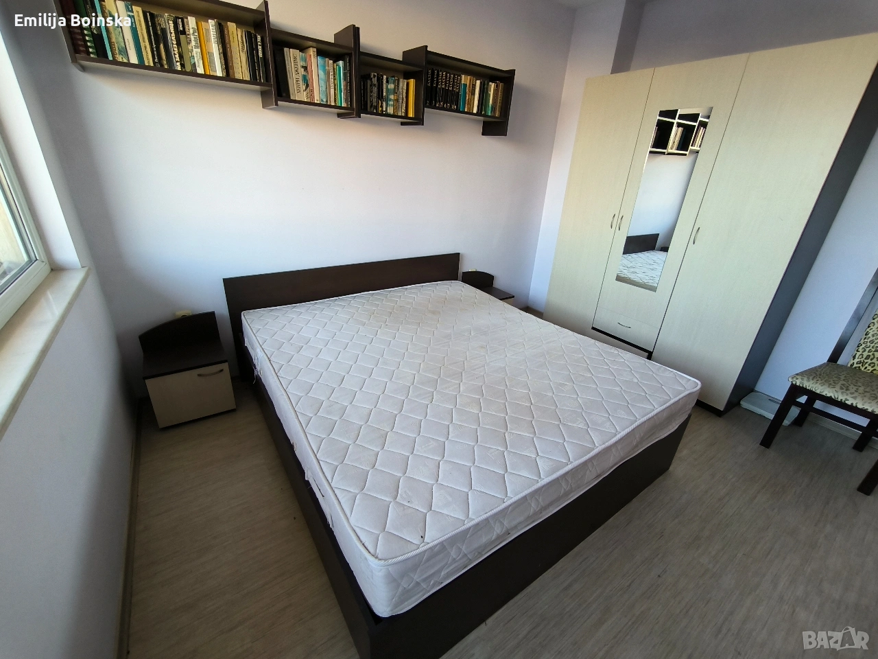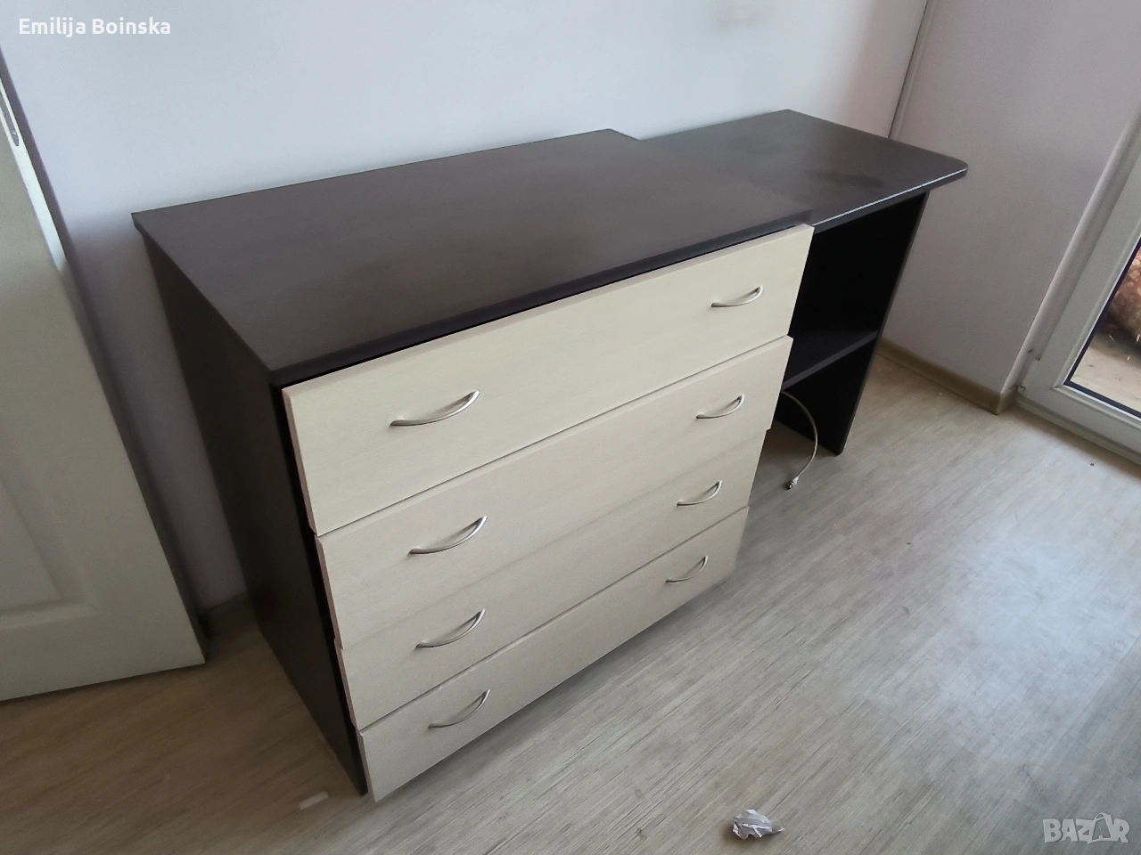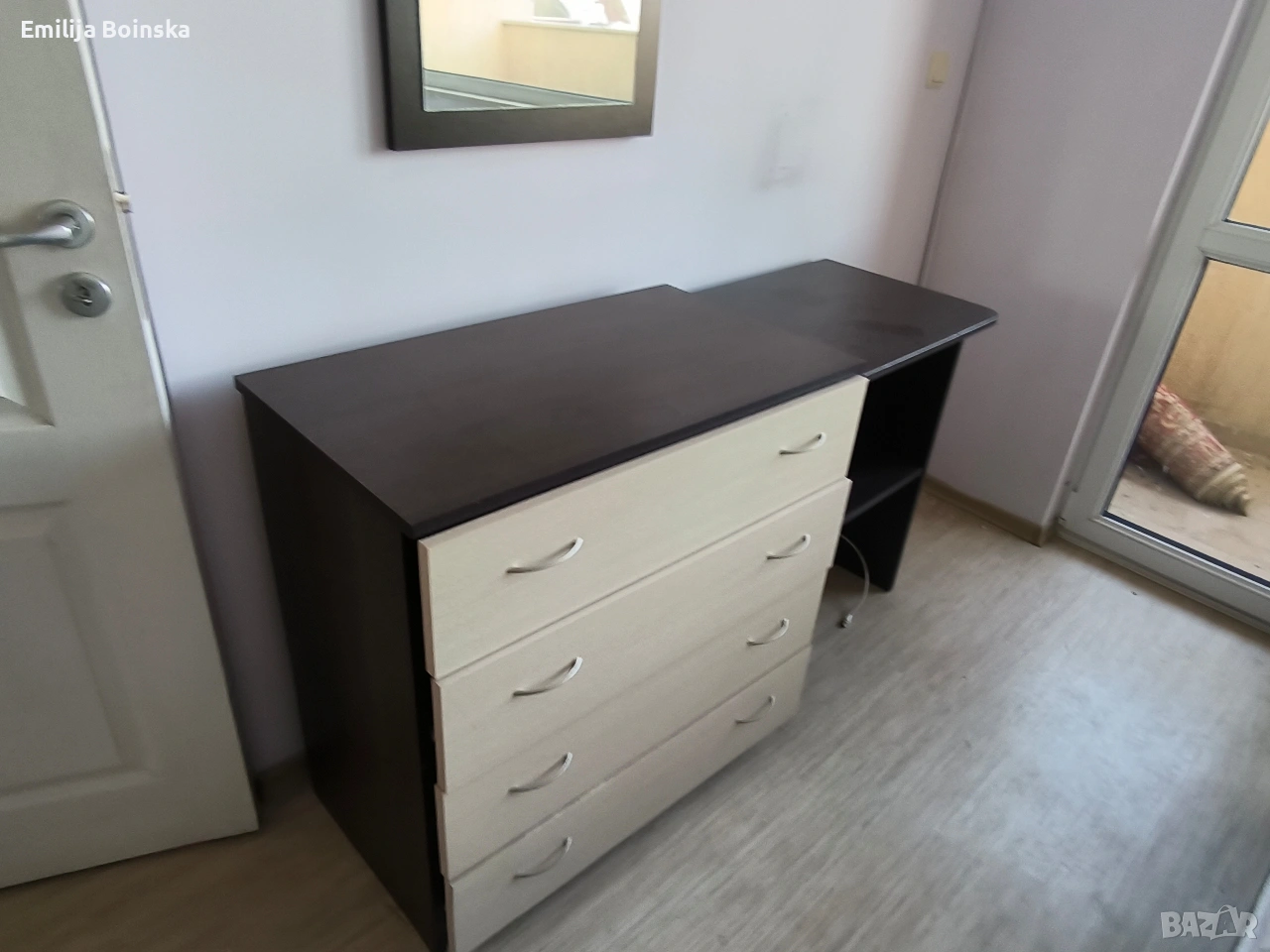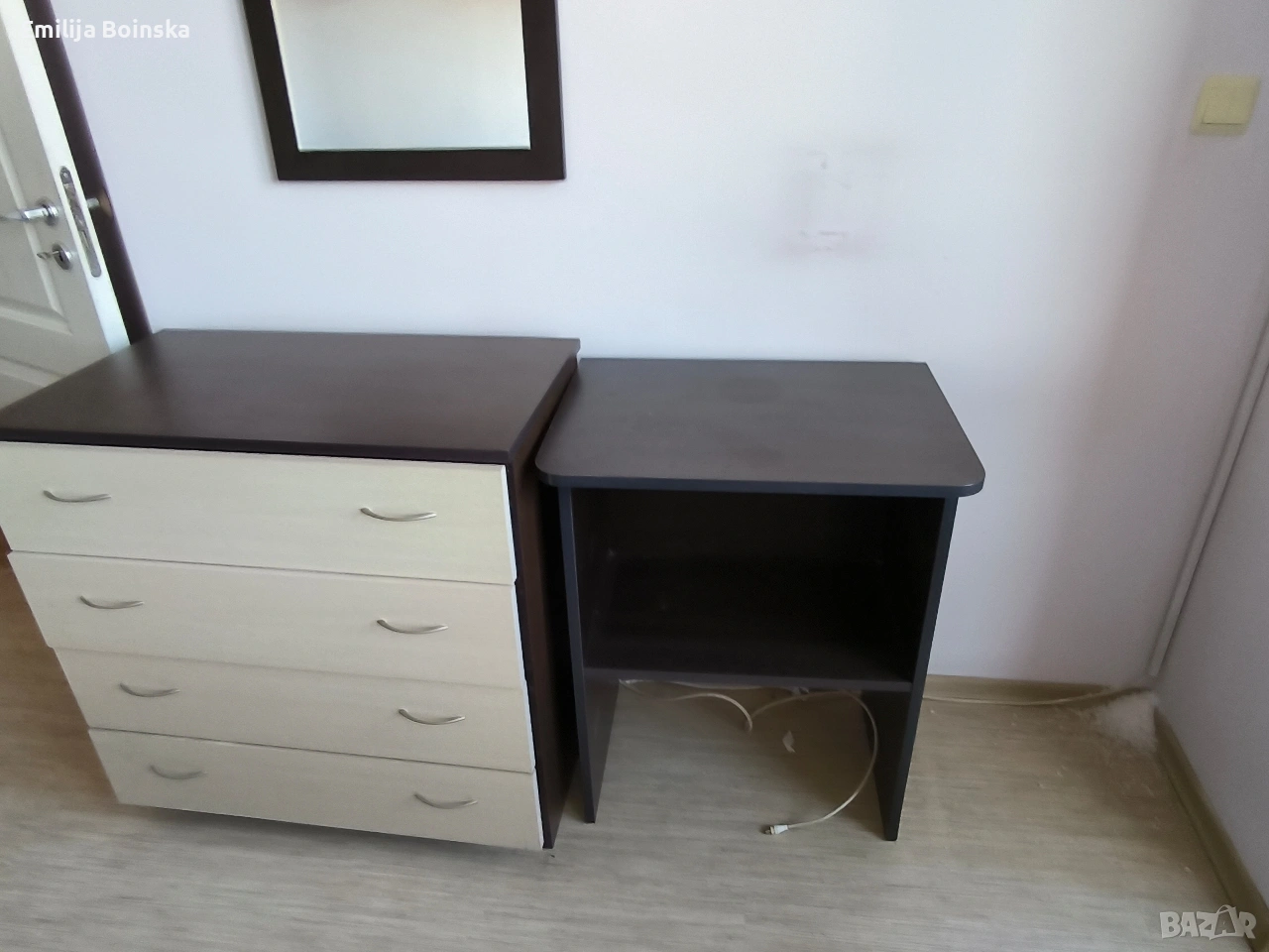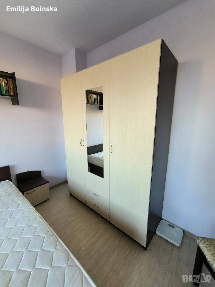 Продавам пълен комплект мебели за спалня в много добро състояние. Модерен дизайн в комбинация тъмно кафяво и светъл дъб. Мебелите са запазени, стабилни и готови за директно ползване. Комплектът включва: Легло + подматрачна рамка + матрак – 240 € Гардероб с огледало – 150 € Скрин (4 чекмеджета) – 80 € 2 нощни шкафчета – 50 €