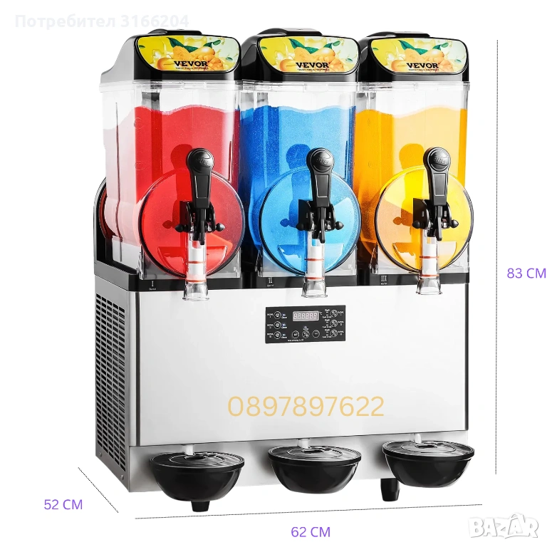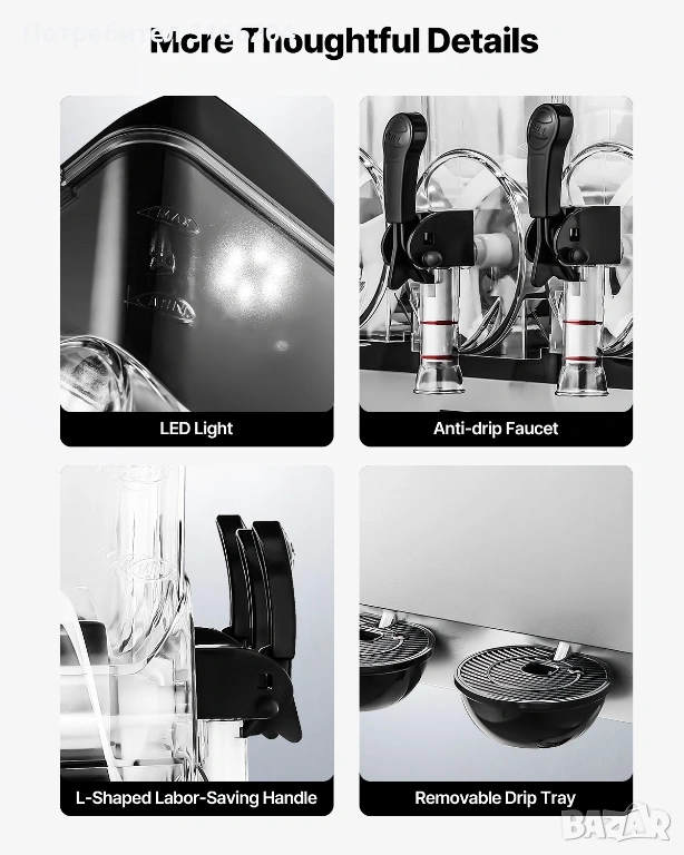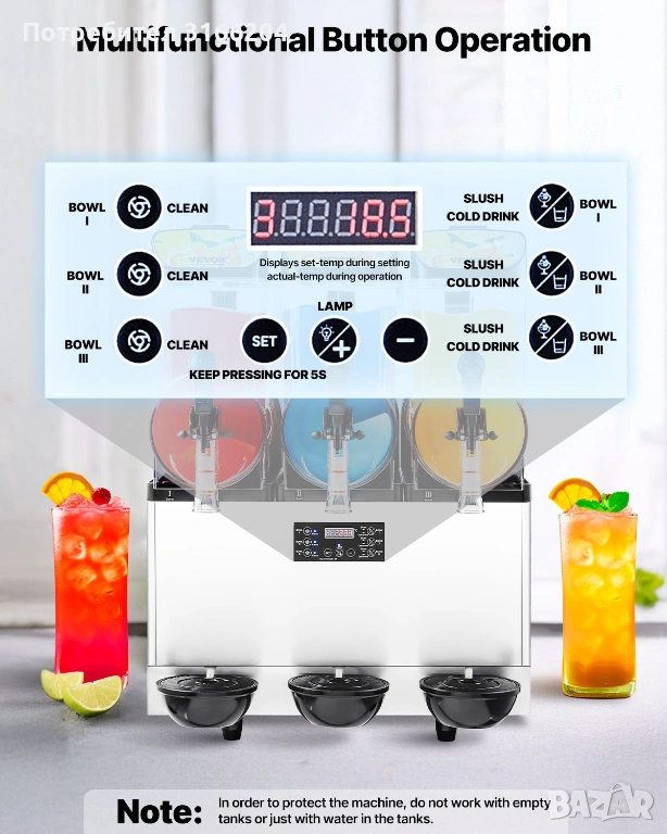 - Три независими резервоара по 15 литра всеки - всеки може да работи самостоятелно, различни напитки едновременно, по-рядко пълнене.