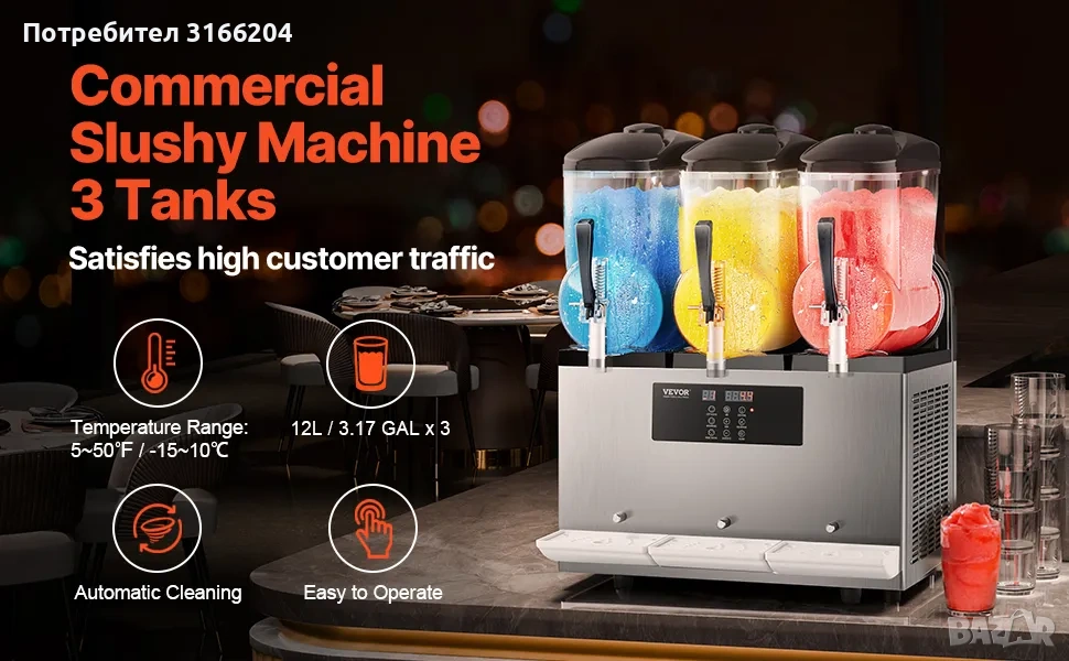 - Три независими резервоара по 12л всеки - всеки може да работи самостоятелно, различни напитки едновременно.