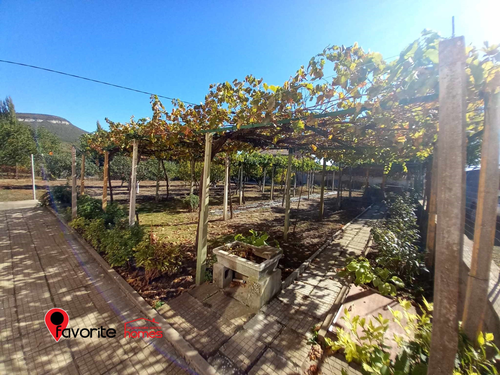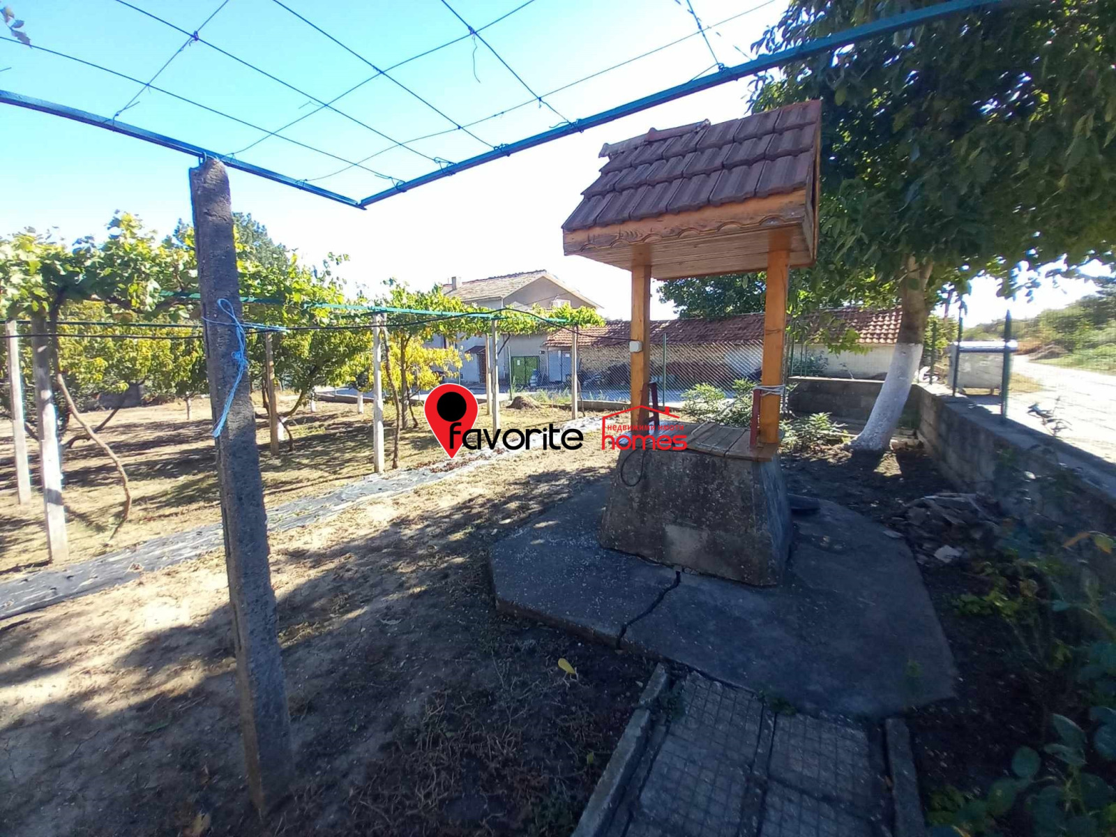 Дворът е РАВЕН, поддържан с площ от 1250кв.м, с улична канализация. Засаден с овощни дървета- сини сливи, ябълки, дюли, праскови, лешници, орехи/ и асма. Разполага с КЛАДЕЦ с хидрофор.
