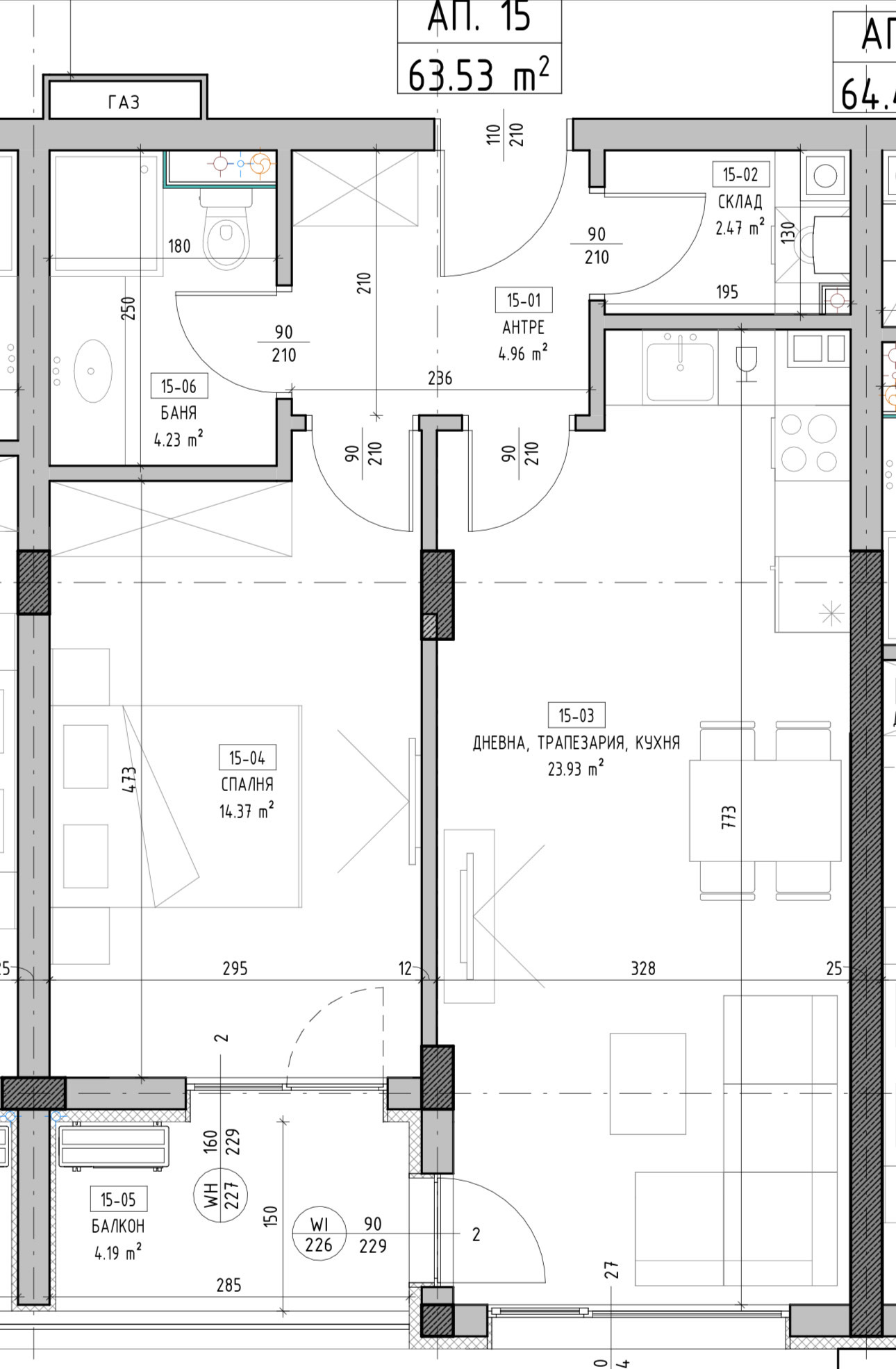 Покривната система включва пароизолационно фолио, 12 см XPS топлоизолация, наклонен бетон и двуслойна битумна хидроизолация с посипка, което допринася за по-ниски енергийни разходи и дълготрайност.