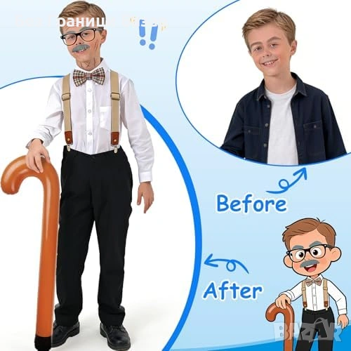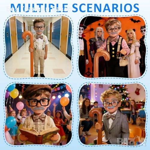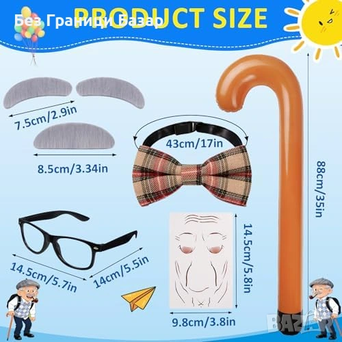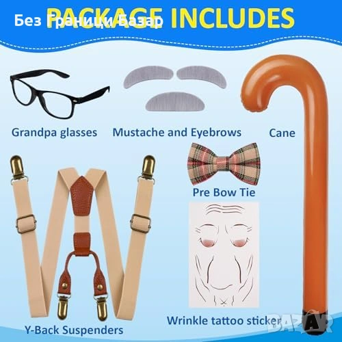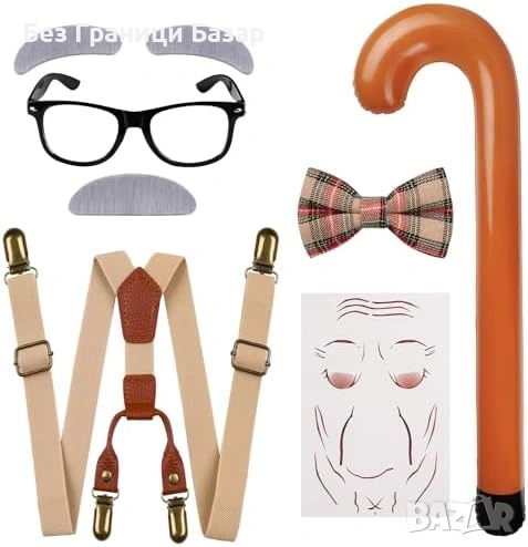 6 части за цялостен „дядо“ образ: сива фалшива брада + вежди, очила, надуваем бастун, Y-образни регулируеми тиранти, червена карирана папийонка, „бръчки“ татуировка