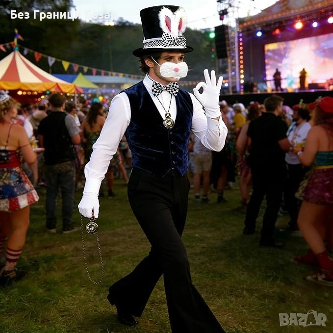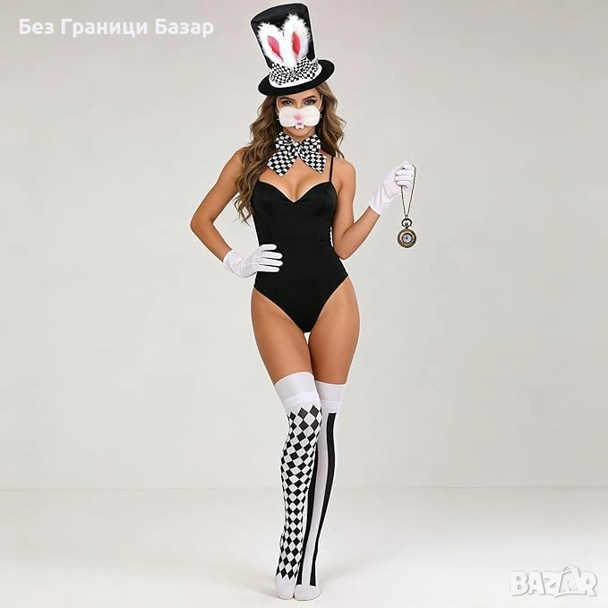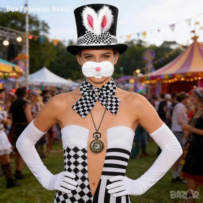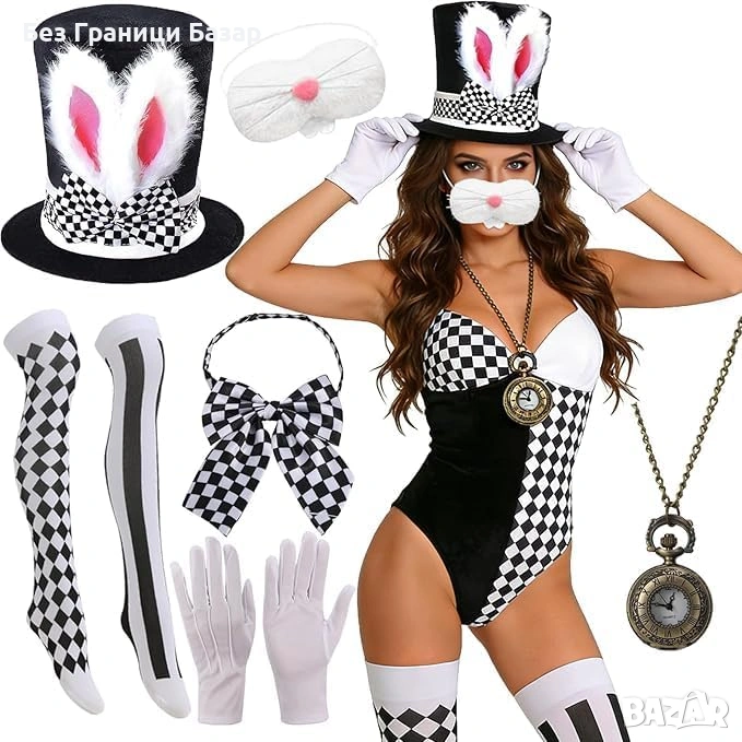 Включва: цилиндър с пухкави заешки уши, папийонка (черно-бяло каре), джобен часовник, бели ръкавици, заешка уста/муцуна, чорапи + допълващи елементи